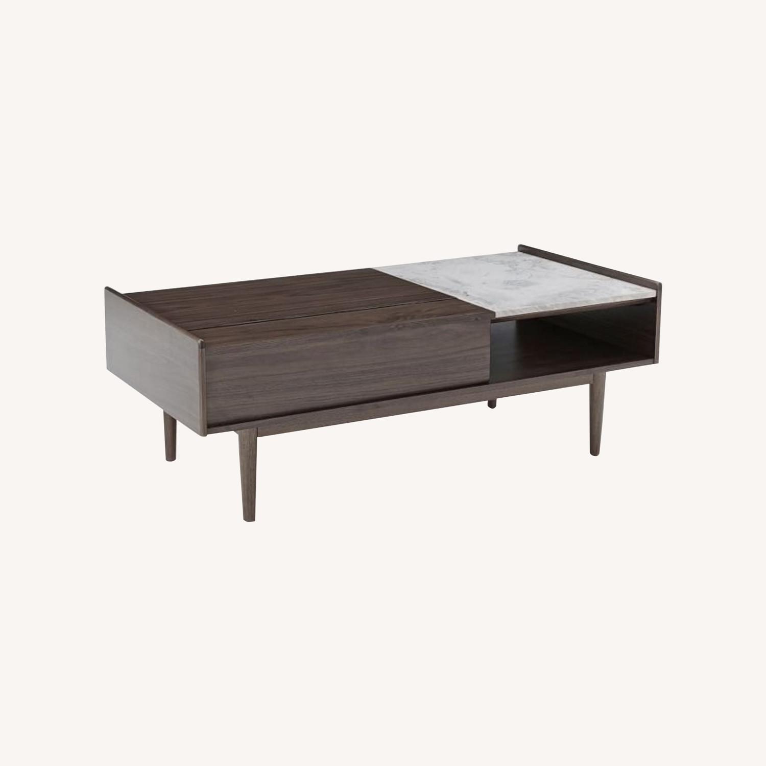 Seller's Notes:Walnut finish is available with a single or double pop-up top. Dark Mineral: Kiln-dried solid eucalyptus wood and engineered wood with Acacia wood veneer. Walnut: Kiln-dried solid eucalyptus wood and engineered wood with walnut veneer. Winter Wood: Kiln-dried solid poplar wood and engineered wood with Ash wood veneer. Made with FSC®-certified wood from responsibly managed forests. Covered in your choice of water-based finish. GREENGUARD Gold Certified. This low-emitting product has been screened for over 10,000 chemicals and VOCs. Marble slab. Natural variations in the color and veining of marble make each piece subtly unique. Top door(s) with pop-up mechanism reveals interior storage. Pop-up top doubles as a workspace or tabletop. Made in Vietnam.