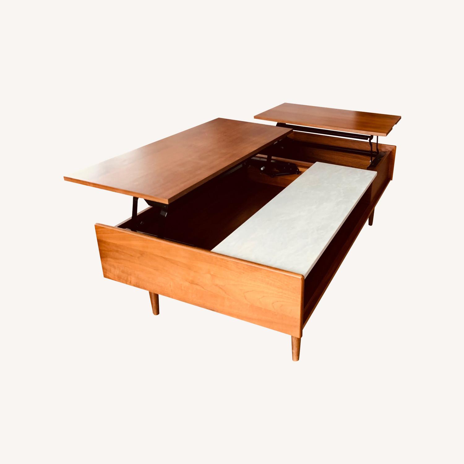 Seller's Notes:Kiln-dried sustainably sourced solid eucalyptus wood and engineered wood with walnut veneer. Marble slab. Streamlined top with iconic beveled edges and tapered walnut finish legs. Double pop-up top reveals hidden storage spaces. Additional open storage on one side. GREENGUARD Gold Certified low VOC product has been screened for over 10,000 chemicals and VOCs. Minor surface scratches on top. Gently loved. 7” clearance from floor. This item will be removed soon—moving sale.