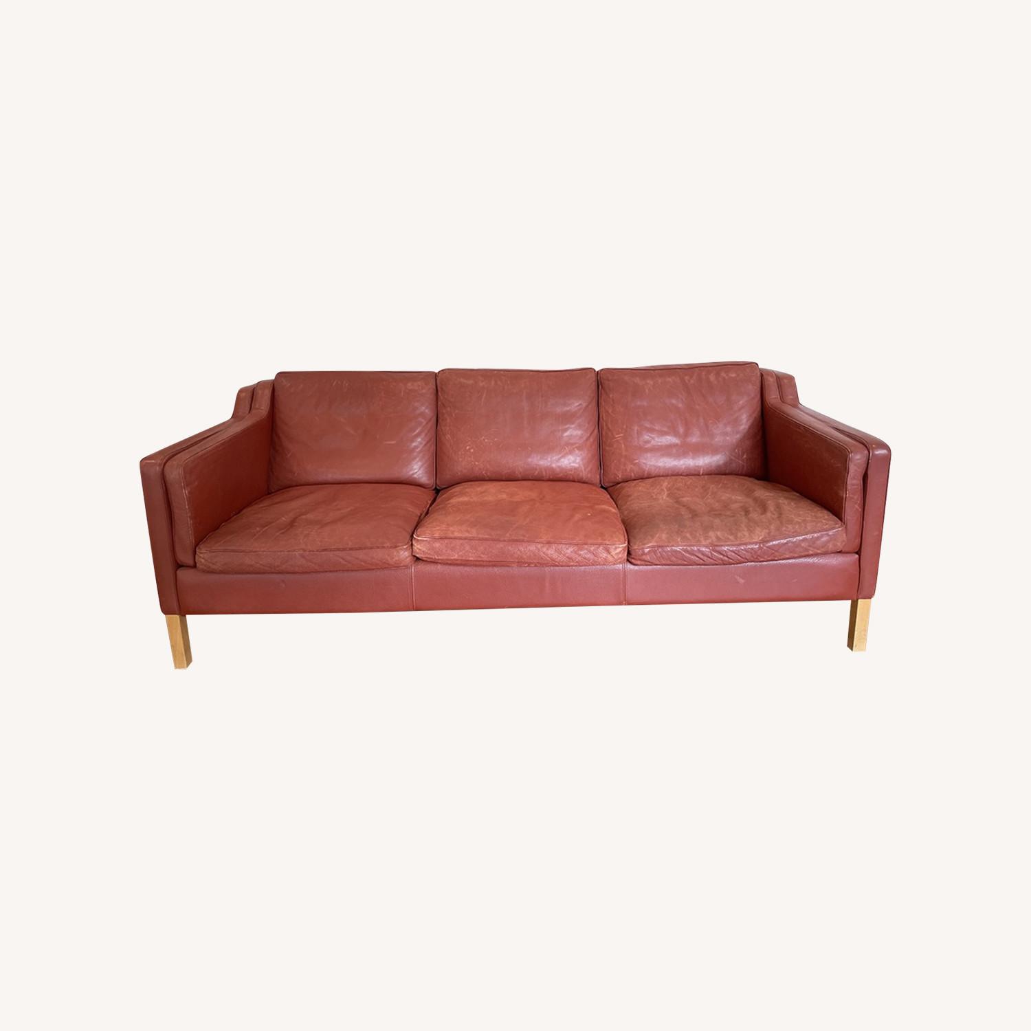 Seller's Notes:Lovingly worn-in and comfortable Mid-Century Modern red leather sofa