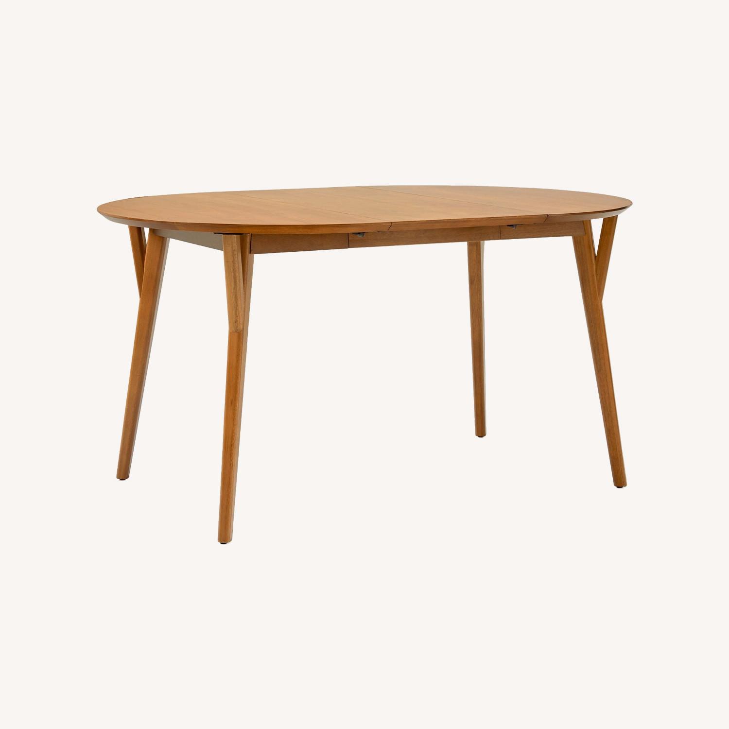 Seller's Notes:Solid eucalyptus wood legs and runner. Walnut wood veneer over engineered wood. Covered in an Acorn finish. All wood is kiln-dried for extra durability. Made with FSC®-certified wood from responsibly managed forests. Table expands via drop-in leaf (included). 42"–60" table is round; 60"–80" table is oval-shaped. Made in a Fair Trade Certified™ factory, empowering workers who made it. This contract-grade item is manufactured to meet the demands of commercial use in addition to residential. See more. Made in Vietnam.