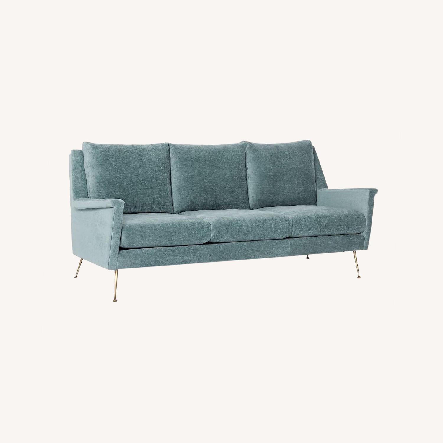 Seller's Notes:This sofa has been the focal design piece of my living room for the past two years. I fell in love with it at West Elm and designed my entire living space around the beautiful muted teal/ocean color. It pairs really well with other colors as well as neutrals, and I love changing up the accent pillows. The sofa is very comfortable yet the cushions are firm enough that they've held their structure over time. The material is called "basket slub" by West Elm, which feels like tightly knitted velvet. The material is also really easy to clean. The legs of the sofa are metal, so you don't have to worry about them getting banged up by vacuums, pets, or movers. Also selling a matching bench that can also be used as a coffee table!