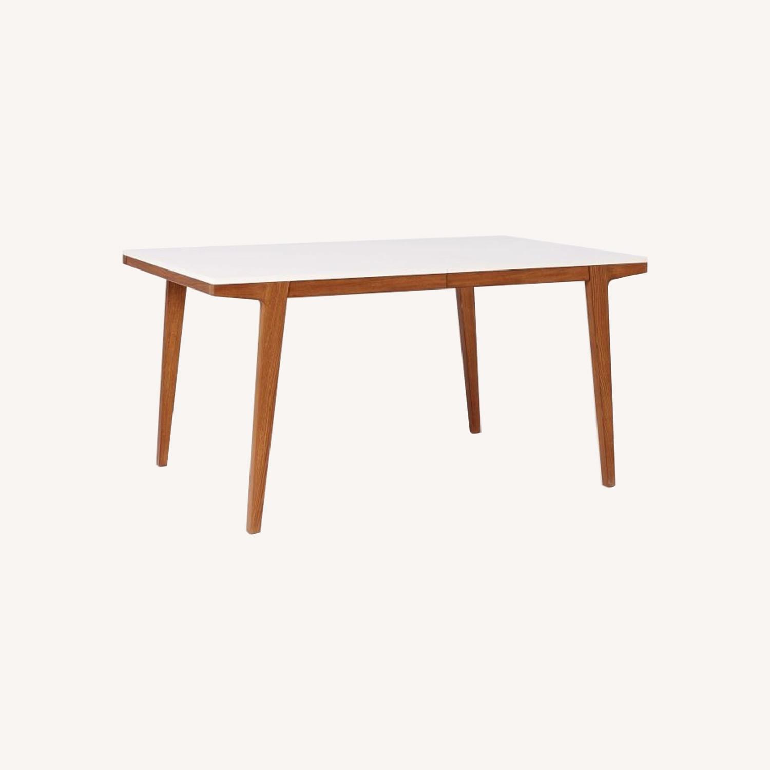 Seller's Notes:West Elm dining table. White lacquer top with wood legs. Expandable with leaf; 60 to 80 inches. Some damage to the finish and scratches on legs, see photos. Sturdy. Excellent for dining or game table needs.
