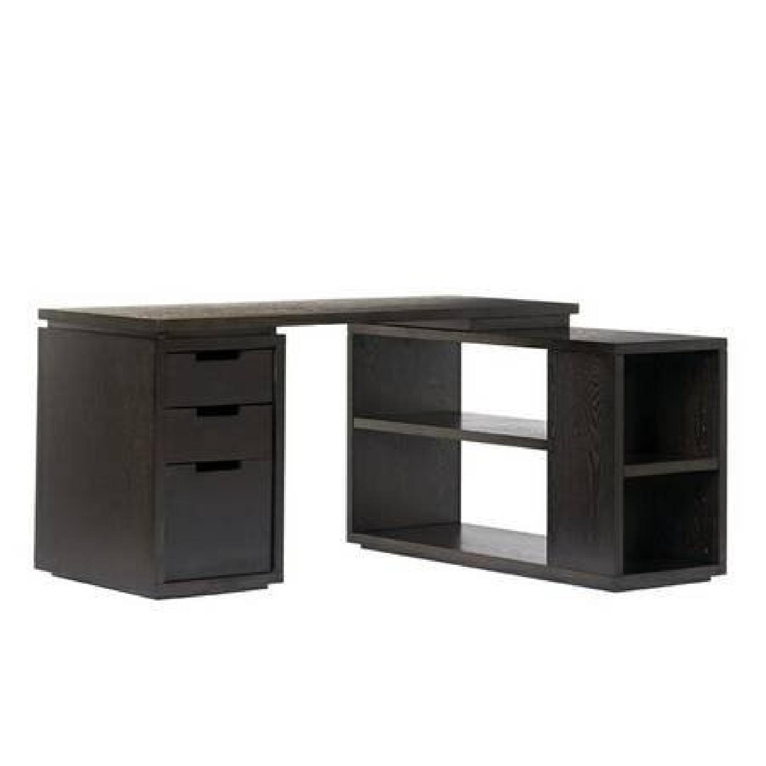 Seller's Notes:This modern corner desk has a built in bookcase and three spacious drawers. Very good condition and has been looked after! Originally over $1,300 Wide bookcase: 48"w x 17"d x 27.25"h 3-drawer unit: 17"w x 22"d x 28"h Rectangle tabletop: 60"w x 24"d x 2.75"h