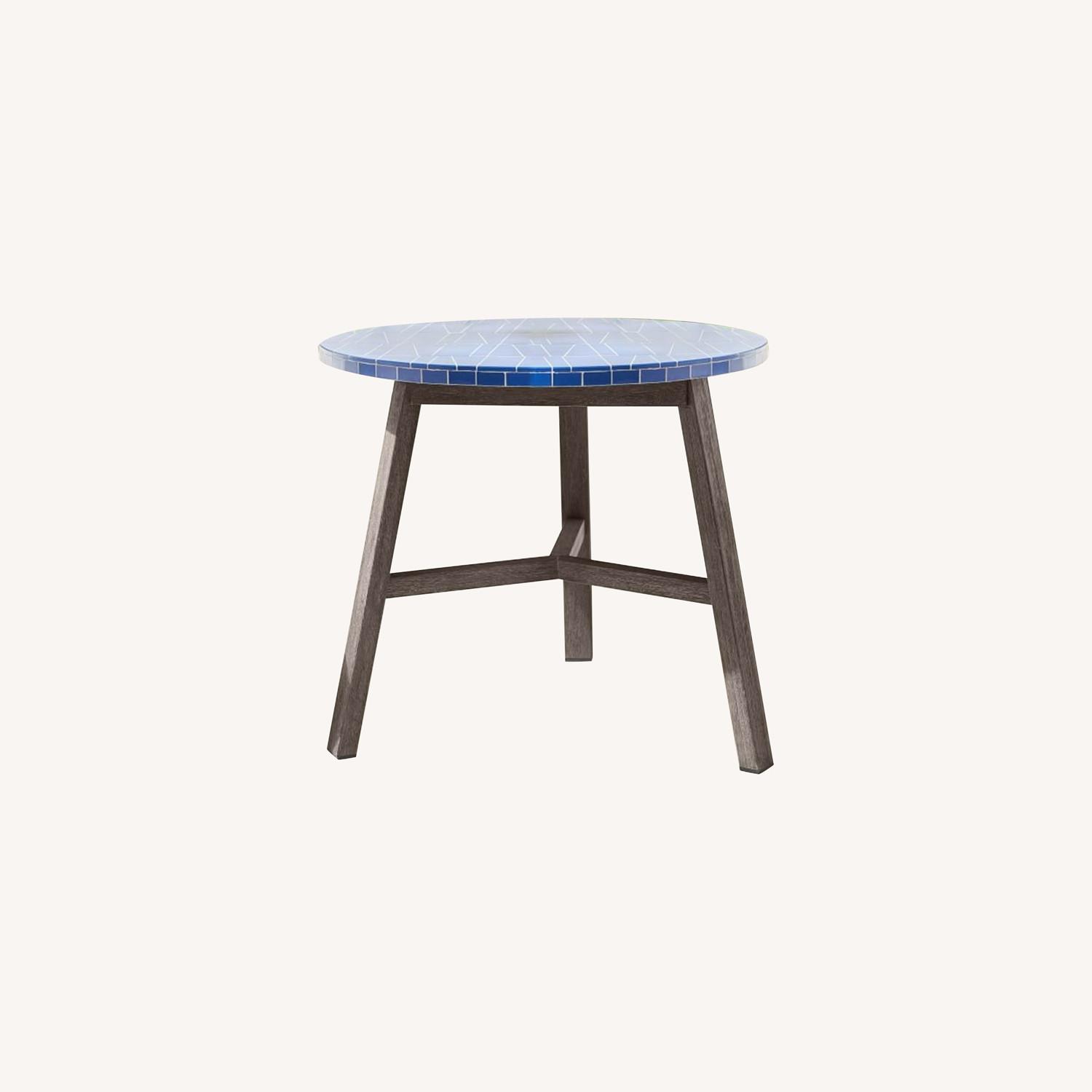 Seller's Notes:Add a little art to your outdoor space with the Mosaic Tiled Bistro Table. Its deep blue ceramic tiles are carefully inlaid by hand onto a sustainably-sourced hardwood base, for a unique look both indoors and out. KEY DETAILS 32"diam. x 28"h. Hand-inlaid ceramic tiles in Landscape Blue. Due to the handcrafted technique, variations in size and pattern will occur. Tropical mix hardwood base.