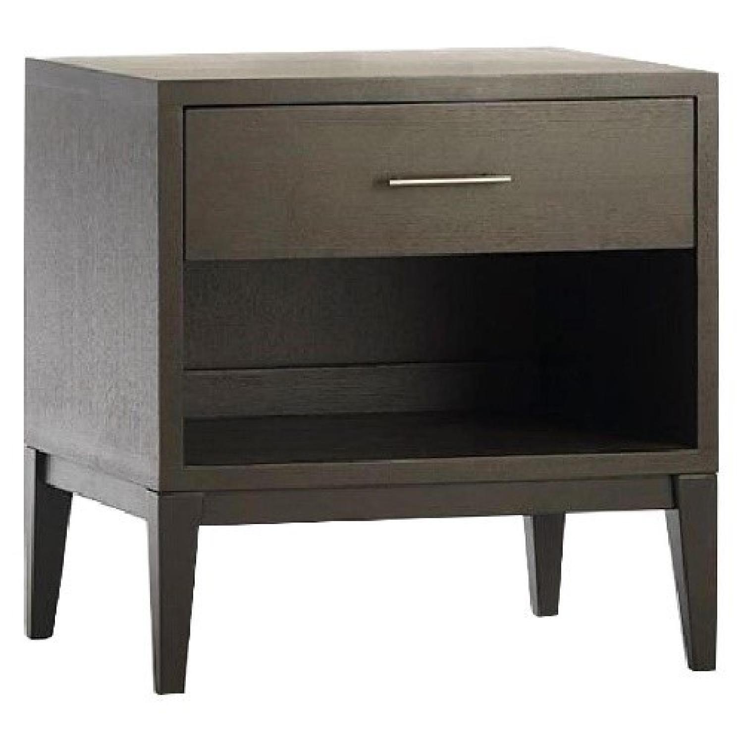 Seller's Notes:Dark stained wood nightstands with modern brushed nickel pulls. West Elm's Narrow Leg storage collection is known for its shapely, angular legs and smart metal drawer pulls. Solid wood construction in chocolate finish.