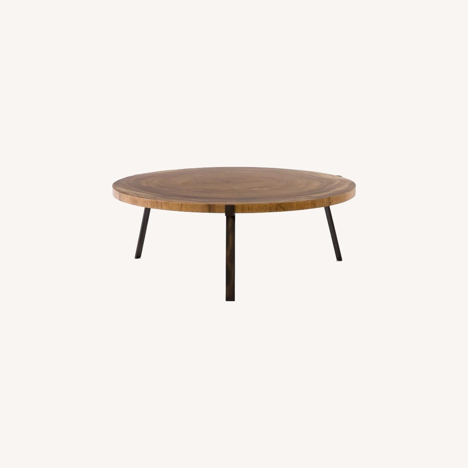 Seller's Notes: Complemented by bronzed finished iron, the round wood top features natural knots for an organic texture. This coffee table is a beautiful modern-minimalist piece that will add warmth to any living space. KEY DETAILS 42.5"diam. x 16"h. Guanacaste wood top in Blonde finish. Iron legs in a Bronze finish. Made in Mexico.