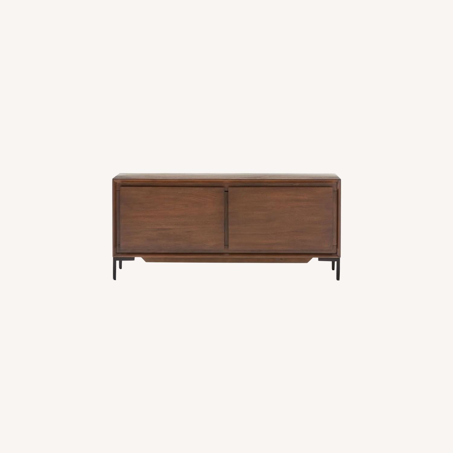 Seller's Notes:Streamlined storage designed to meet all your needs, the Nolan Collection features a sturdy wood frame with bronze-finished accents. This ultra-functional bench can be paired with other pieces in the collection to create your ideal storage system. KEY DETAILS 42"w x 15.75"d x 18.5"h. Dark Walnut: Solid kiln-dried poplar wood frame; facades and interiors feature real walnut veneer over engineered wood. White: Lacquered engineered wood. Metal legs. Two doors open to reveal interior storage. Made in Vietnam.