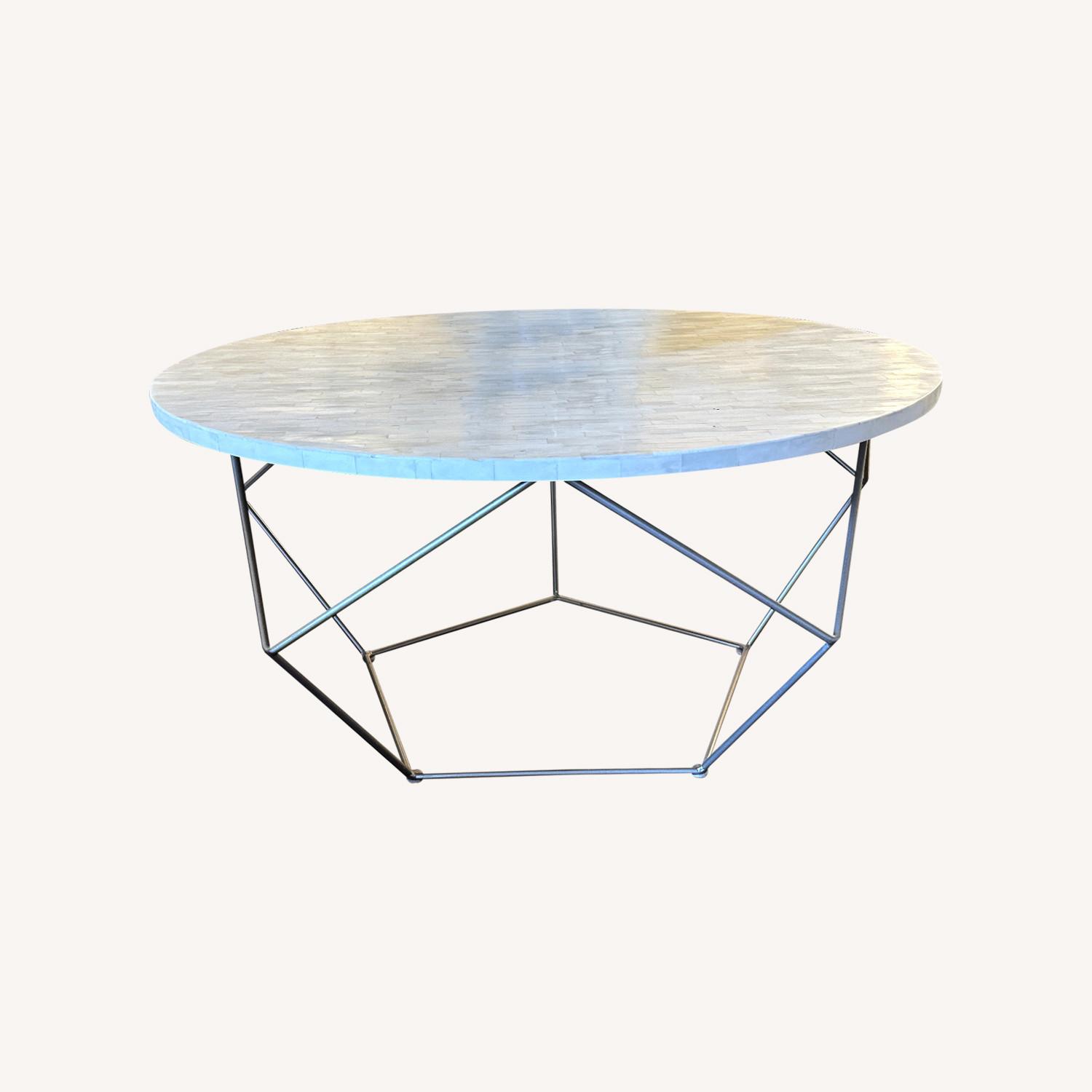 Seller's Notes:Excellent condition, lightly used, no stains. Pet free, smoke free home. Estimated retail ~$500. Hand-inlaid natural bone tile top. Due to the natural materials used, tile coloring ranges from bright white to light tan. Metal base in a Gunmetal finish. 34"diam. x 18"h.