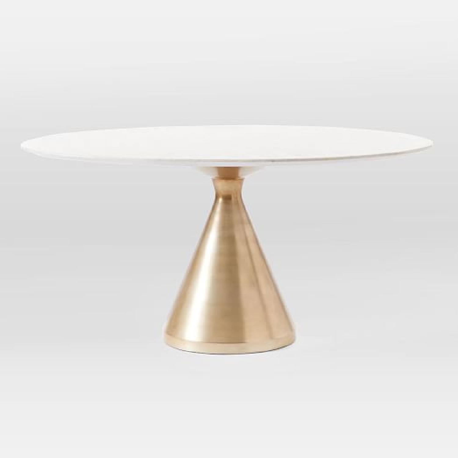 Seller's Notes:Great condition West Elm oval white marble/antique brass dining table. Size: 60” W x 42” D x 29.5” H. Very convenient table to use; easy to maintain; I like it so much; I am selling due to move. Natural marble lines and dark spots in the white marble: those features were part of the white marble at the time I bought it.