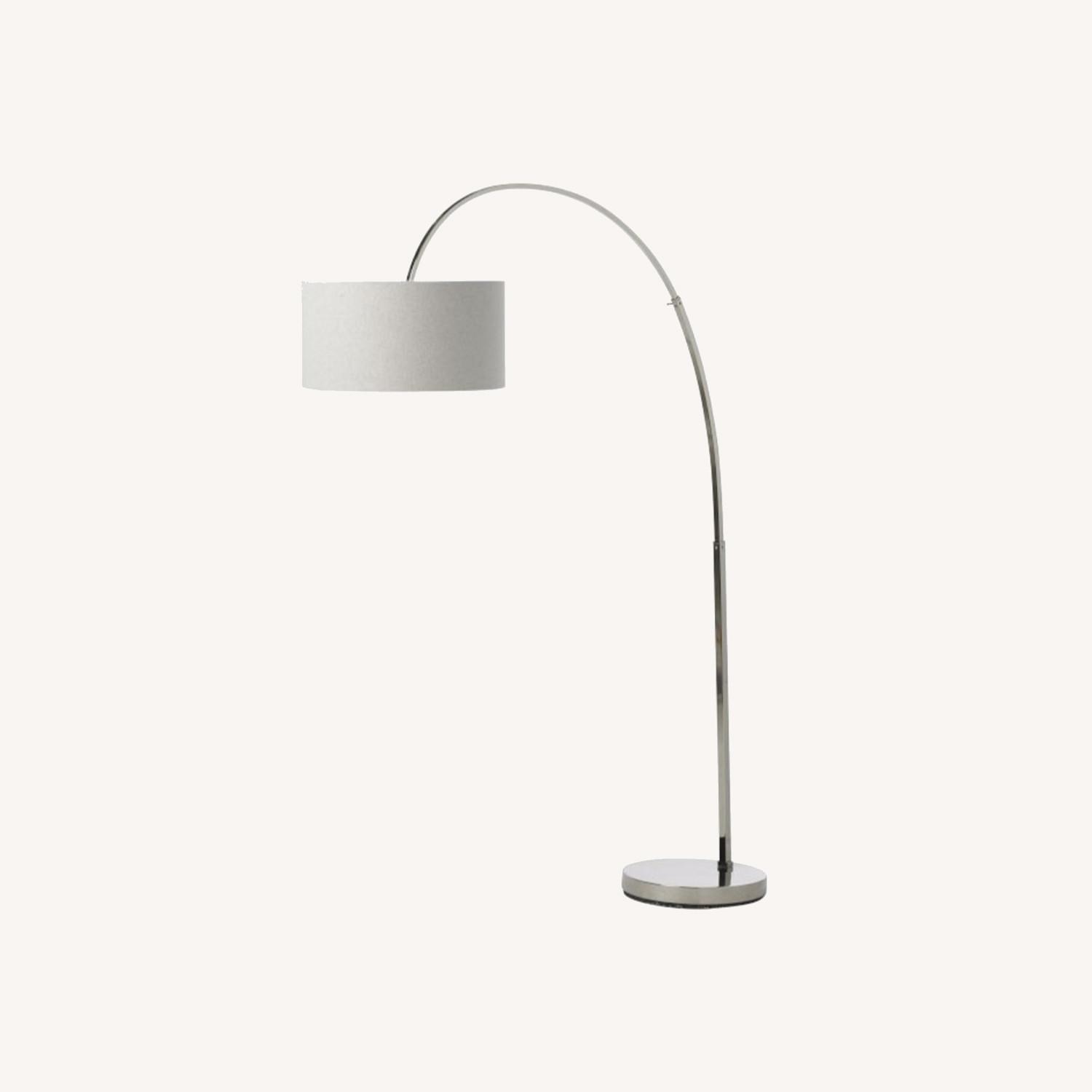 Seller's Notes:West Elm overarching floor lamp with chrome base and light grey linen lamp shade. Gracefully swoops over a sofa, table or chair and provides fantastic light - I have no overhead lighting in my living room and it lights my entire room (11x20) with just this and one table lamp.