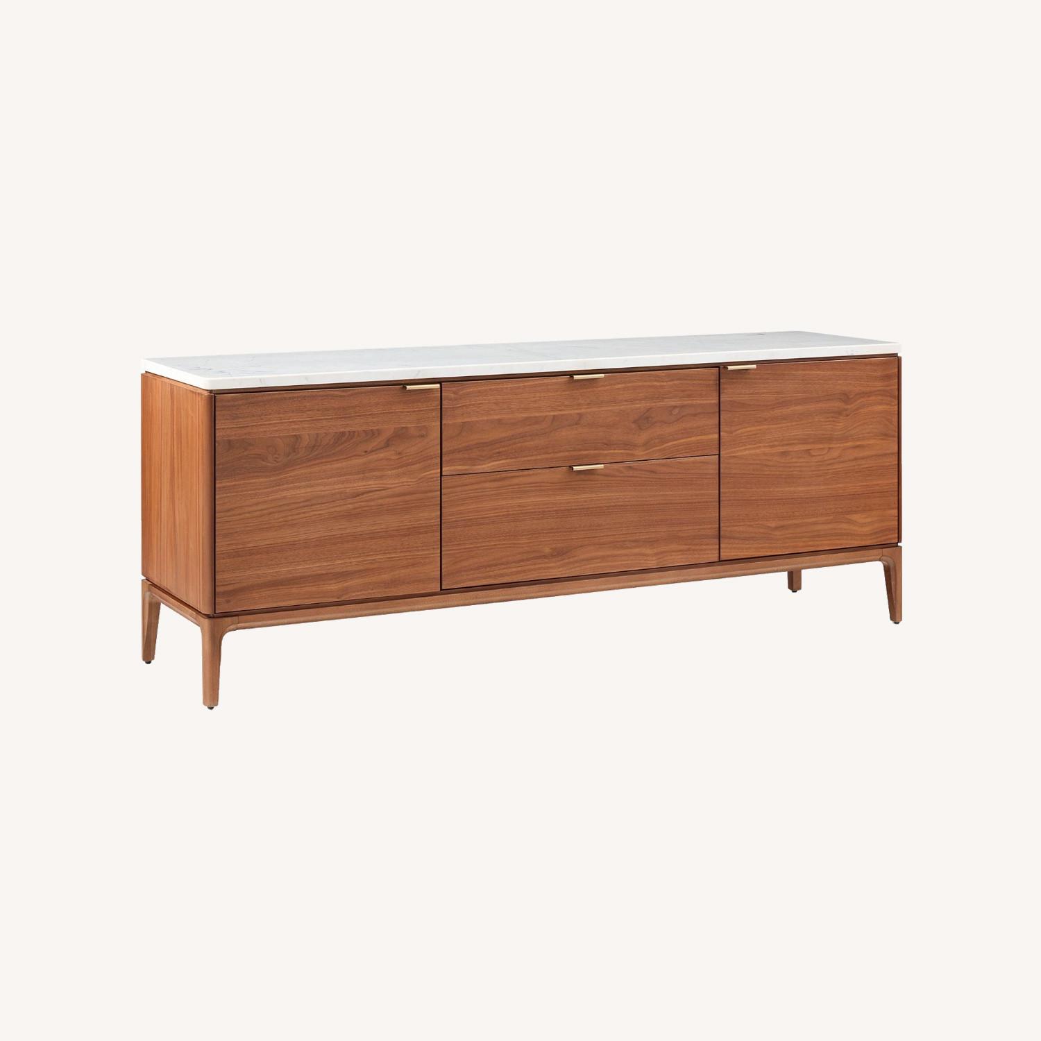 Seller's Notes:Solid marble top. Solid and engineered wood frame and legs. Walnut veneer over engineered wood drawer fronts. Covered in a water-based Cool Walnut finish. All wood is kiln-dried for added durability. Made with FSC®-certified wood from responsibly managed forests. 68" console: 2 drawers and 2 cabinets with 1 fixed shelf in each. Made in a Fair Trade Certified™ factory, empowering workers who made it. Made in Vietnam.