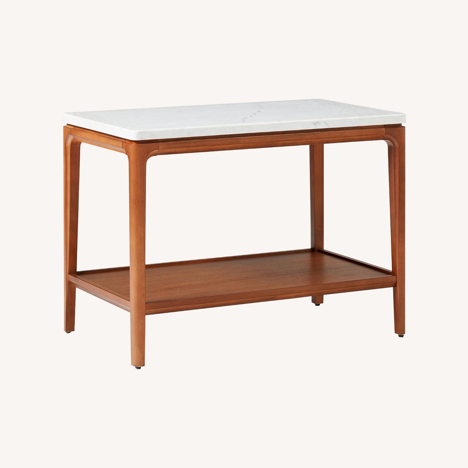 Seller's Notes:Top: Solid marble. Sides, frame & legs: Solid wood. Bottom shelf: Walnut veneer over engineered wood. Covered in a water-based Cool Walnut finish. All wood is kiln-dried for added durability. Made with FSC®-certified wood from responsibly managed forests. Made in a Fair Trade Certified™ facility, directly benefiting the workers who make it. Made in Vietnam.