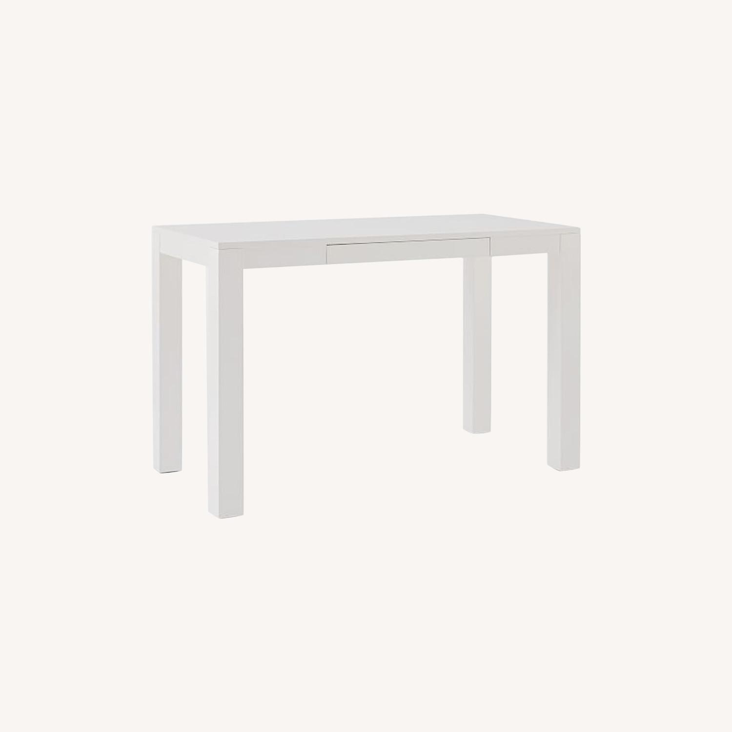 Seller's Notes:This update of the original iconic Parsons Table has square legs the same thickness as its top, an exacting equation of modern design. With a hidden drawer, the Parsons Desk works just as well as an entryway table, dining room buffet or media console as it does in your home office. KEY DETAILS 48"w x 24"d x 30"h. White: Engineered wood in a White lacquer finish. Cool Walnut: Kiln-dried solid mahogany & engineered wood in a Cool Walnut finish. One drawer closes flush.