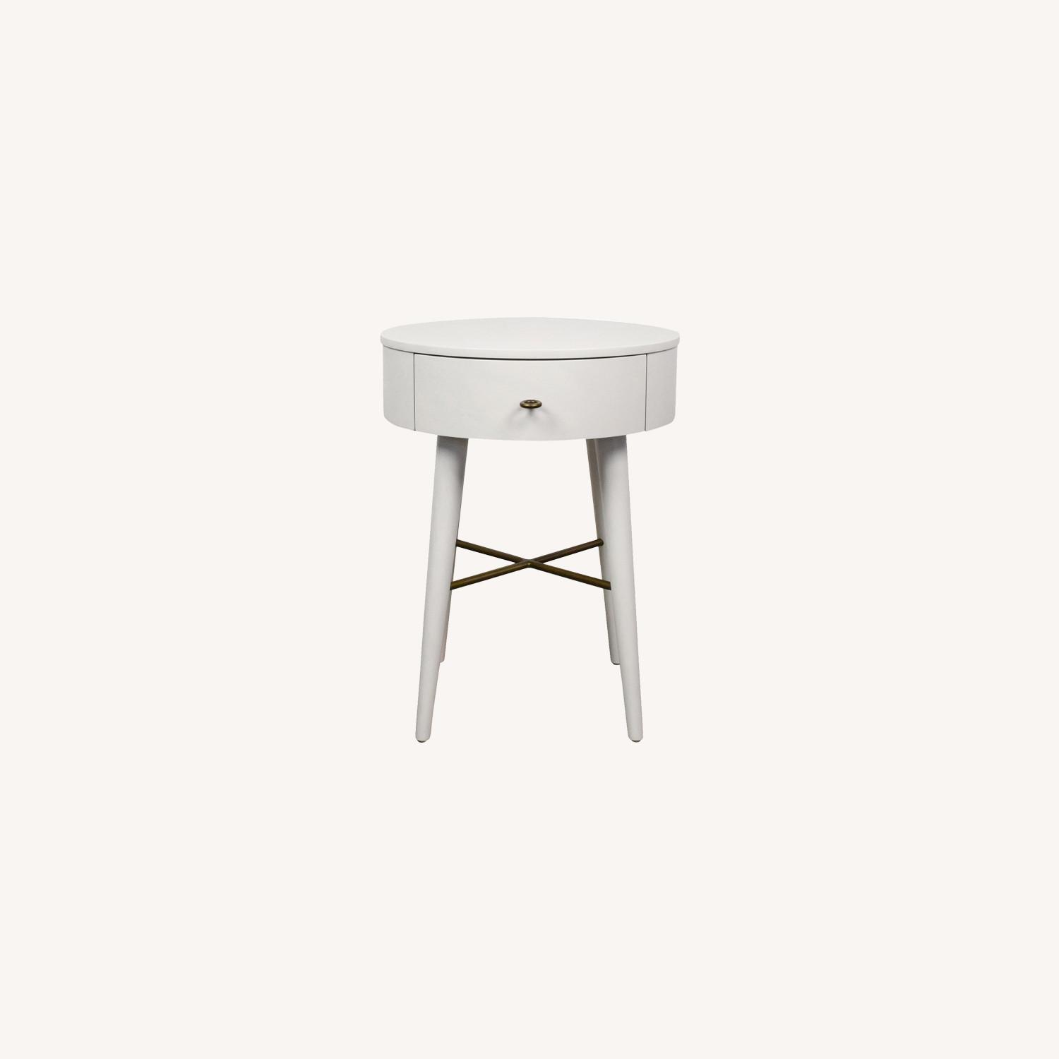 Seller's Notes:Penelope round nightstand in white with one drawer Brand: West Elm Dimensions: 18" W x 24" H x 18" D