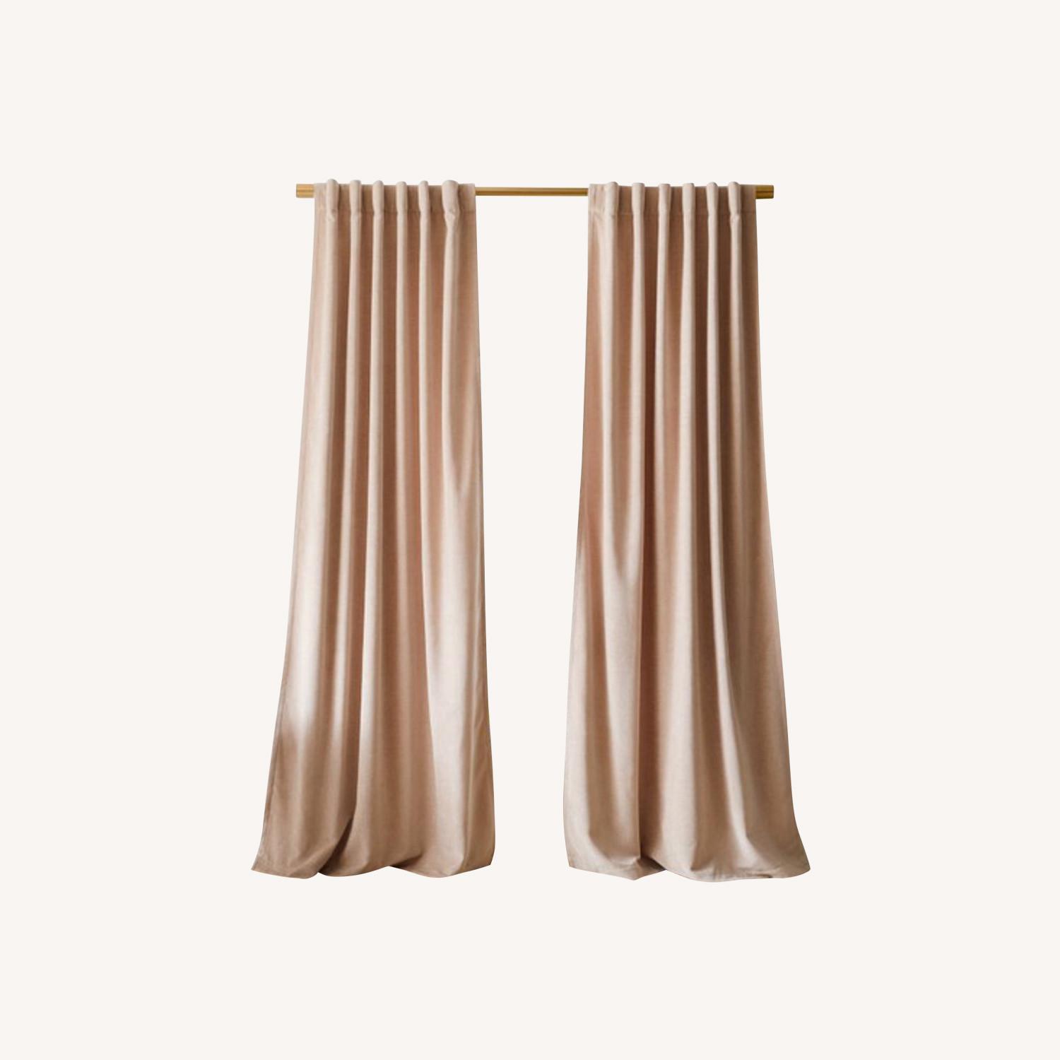 Seller's Notes:West Elm Dusty Blush Velvet Blackout Curtains. 96" length. Included 6 each for the price of 2! including Gold Curtain Rods and 2-layer Curtain Hooks. The curtain Rods have an acrylic diamond shape end. They can be rotated to 45 or 90 degrees.