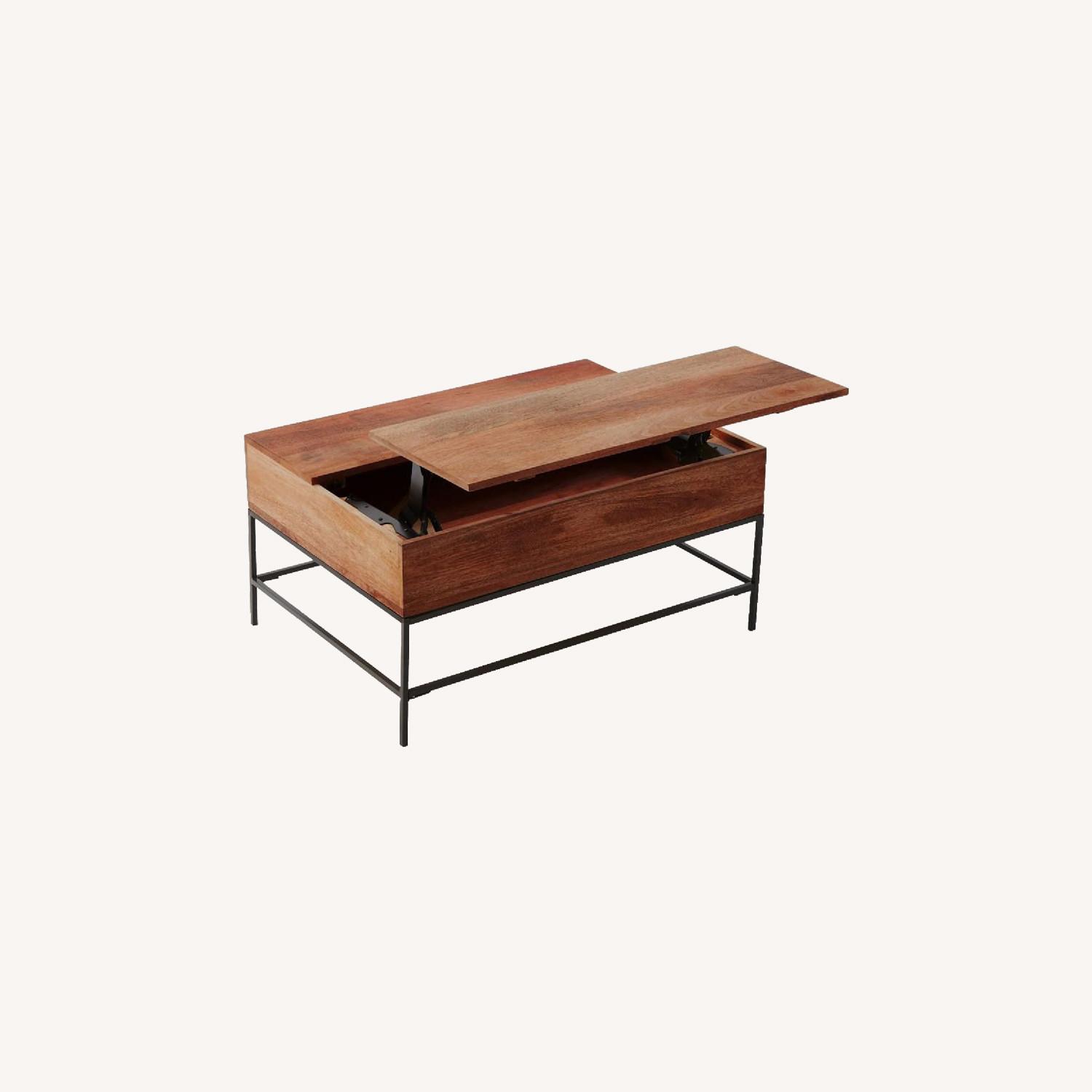 Seller's Notes:West Elm Coffee Table in Cafe with brush bronze legs. Color no longer available with West Elm. Bought for new apartment and doesn't work in the space. Original price $599 plus tax. Overall: 36"w x 26"d x 17.75"h. Height with pop-up: 25"h. Inner storage: 32"w x 22"d x 6.5"h. Clearance (rung to floor): 4".