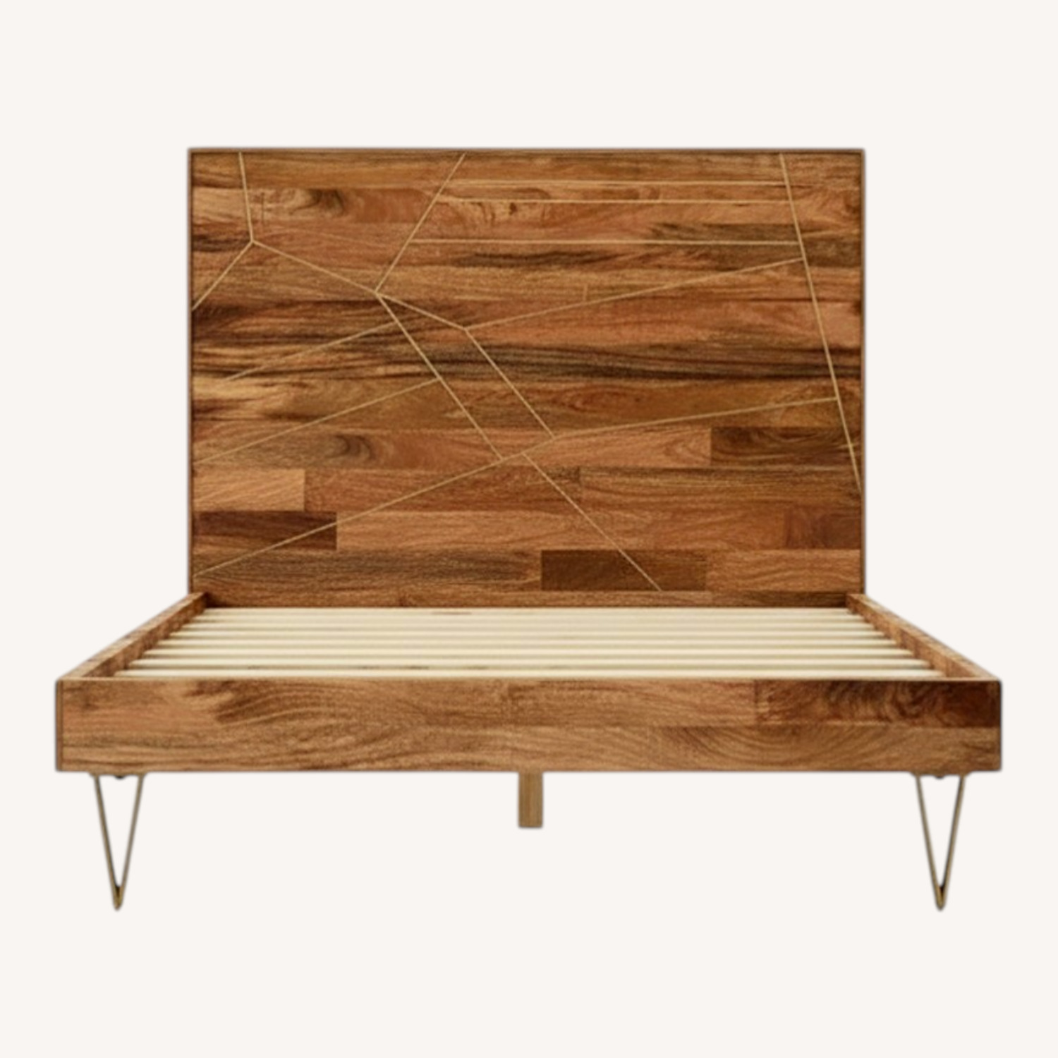 Seller's Notes:Here is the original West Elm description: Creative firm Roar & Rabbit's designs blend modern style with whimsical details. West Elm worked with them to create this Geo Inlay Bed. Antique brass-finished metal is inlaid into wood for a luxe look with geometric texture and subtle shine. Features Include: -Mid-Century Modern Style -Solid raw mango wood -Metal details and legs in an Antique Brass finish -Made in a Fair Trade Certified™ facility -The mango wood used on this product is sustainably sourced from trees that no longer produce fruit. -Accommodates most standard mattresses; box spring optional. Overall product dimensions: 56"w x 78"d x 52"h. Side rail dimensions: 75"w x 3.25"d x 5.5"h. Floor to top of side rail: 13.5". Clearance: 8"