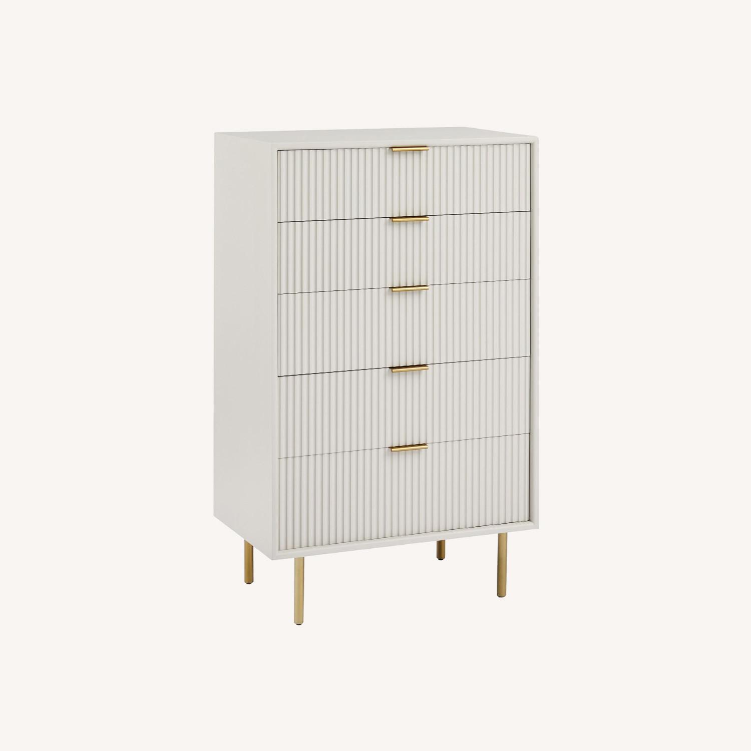 Seller's Notes:Frame: Solid mahogany wood. Drawer fronts: Fluted rubberwood (Wood/White) or engineered wood (Haze). Sides: Engineered wood in a water-based White or Haze finish. Metal hardware: Dark Bronze (Wood/White) or Antique Brass (Haze) finish. 5 drawers open on metal glides. Legs have built-in levelers to adapt to varying floor levels. Made in Indonesia.