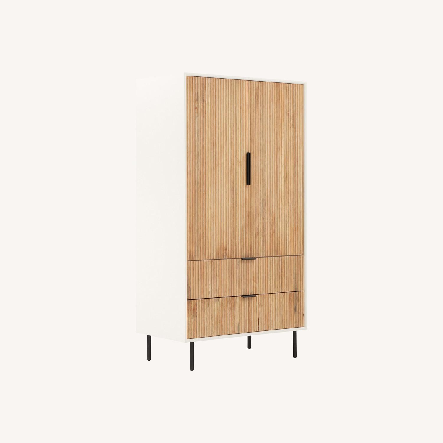 Seller's Notes:Frame, top, and sides: Engineered wood in a water-based White finish. Front: Fluted rubberwood in a water-based Cerused White finish. All wood is kiln-dried for added durability. Metal hardware in a Dark Bronze finish. 2 drawers open on metal glides. Drawers feature English Dovetail joinery. 2 doors open to interior storage space. Built-in coat rack with 4 knobs. Built-in mirror. 1 metal closet rod. Legs have built-in levelers to adapt to varying floor levels. This contract-grade item is manufactured to meet the demands of commercial use in addition to residential. See more. Made in Indonesia.