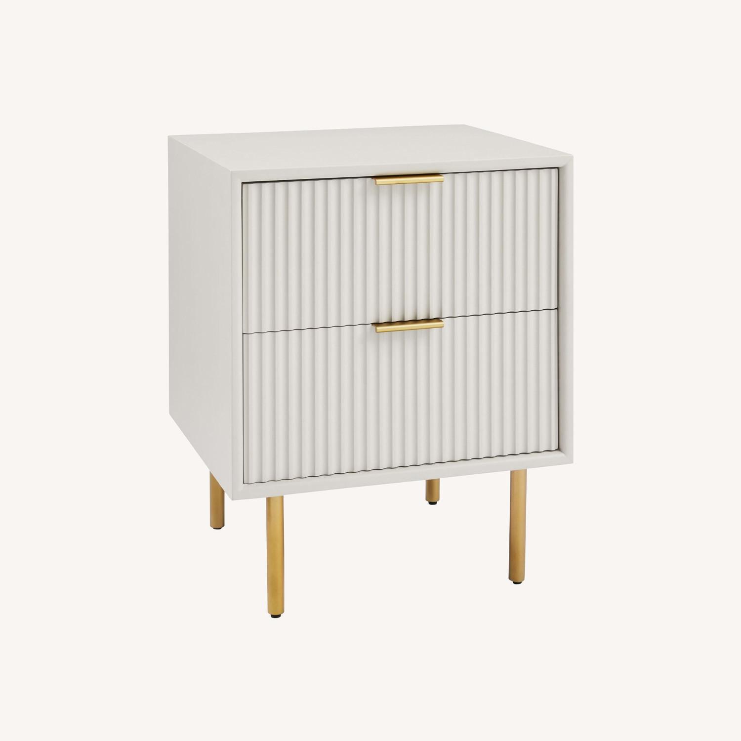 Seller's Notes:Frame: Solid mahogany wood. Drawer fronts: Fluted rubberwood (Wood/White) or engineered wood (Haze). Sides: Engineered wood in a water-based White or Haze finish. Metal hardware: Dark Bronze (Wood/White) or Antique Brass (Haze) finish. 2 drawers open on metal glides. Charging version has 2 power outlets, 2 USB ports and plug-in cord on reverse. Sold individually or as set of two. Made in Indonesia.