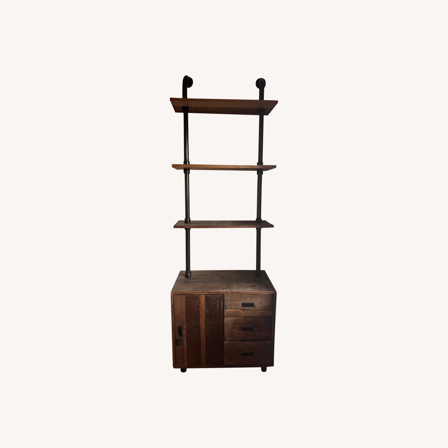 Seller's Notes:One-of-a-kind shelving unit made with all reclaimed wood and black piping. Three shelves above base cabinet, which gives you four shelves of space. Three drawers and one sliding cabinet. Plenty of space for open and enclosed storage. This is a great piece, made with environmentally friendly materials, and has beautiful tiny blue detailing when you look closely. Perfect for small pockets of space and looks custom designed once it's mounted. Mounts to the wall at the top. Slight scuffing at mounting area as pictured.