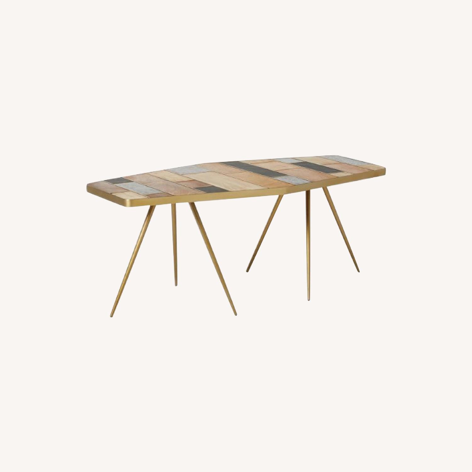 Seller's Notes:This is part of the West Elm Roar + Rabbit collection. It is a patchwork wood, slate and metal coffee table. Modern look and feel. Thin legs keep the design simple, airy and interesting. There is a minor liquid stain on a wood panel, but not super noticeable. Overall in good shape. Just needs a new home!
