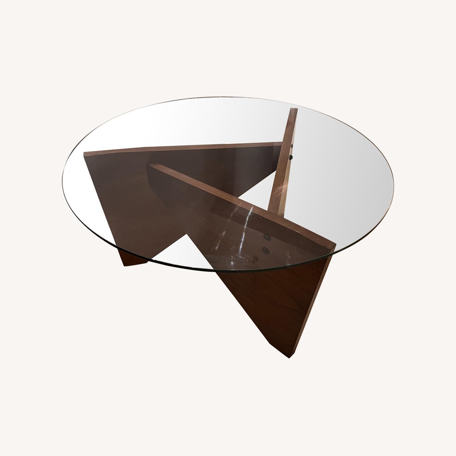 Seller's Notes:West Elm glass coffee table with a wooden base in great condition! 32 inch diameter means coffee table is a great size-- not too big, not too small. Super easy to keep clean. Goes with almost every couch/ chair. Delivery fees are 100% covered!