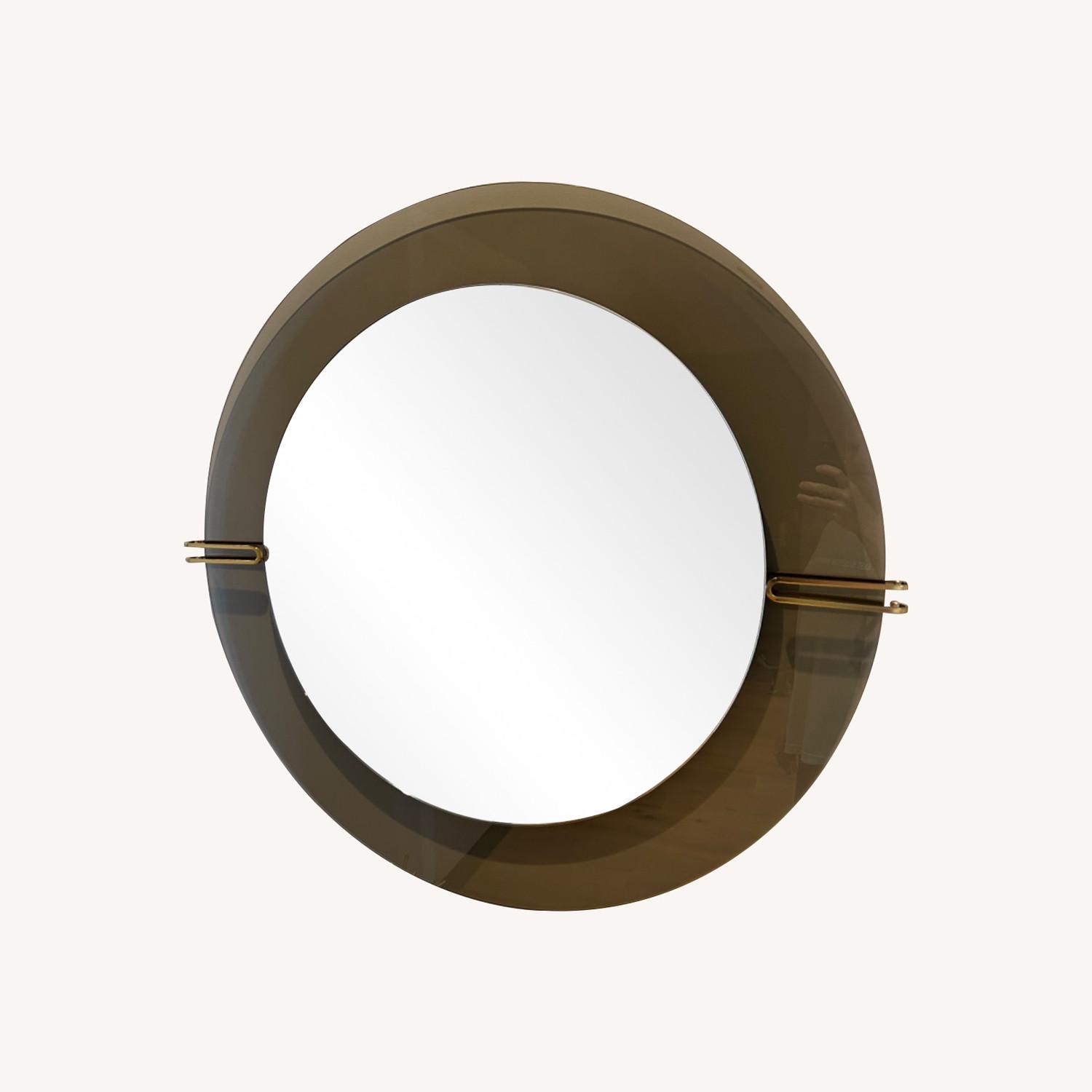 Seller's Notes:West Elm round wall mirror, mid Century/Gothic style that has been discontinued. 37.75" diameter and ~ 1.75" deep. Like new, no blemishes of any kind. Is a blend of mirror, brown glass, and gold.