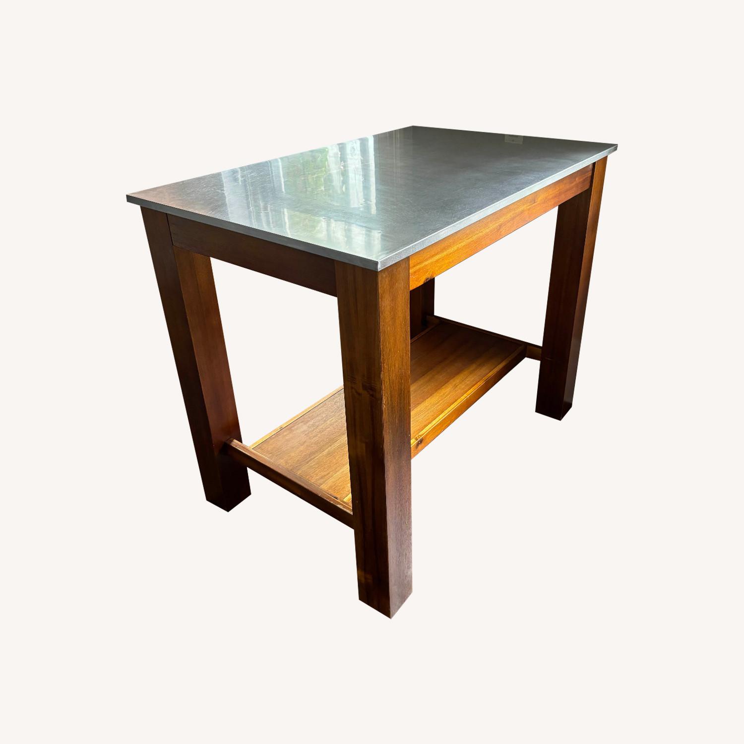 Seller's Notes:We are moving, and no longer need this table. Discontinued West Elm Rustic Kitchen Island has stainless steel wrapped top & solid acacia wood construction. Convenient shelf underneath. Perfect for use as a kitchen island or dining table. There is some minor scratching on table top surface, legs, and shelf. I tried to include detailed photos of all imperfections.