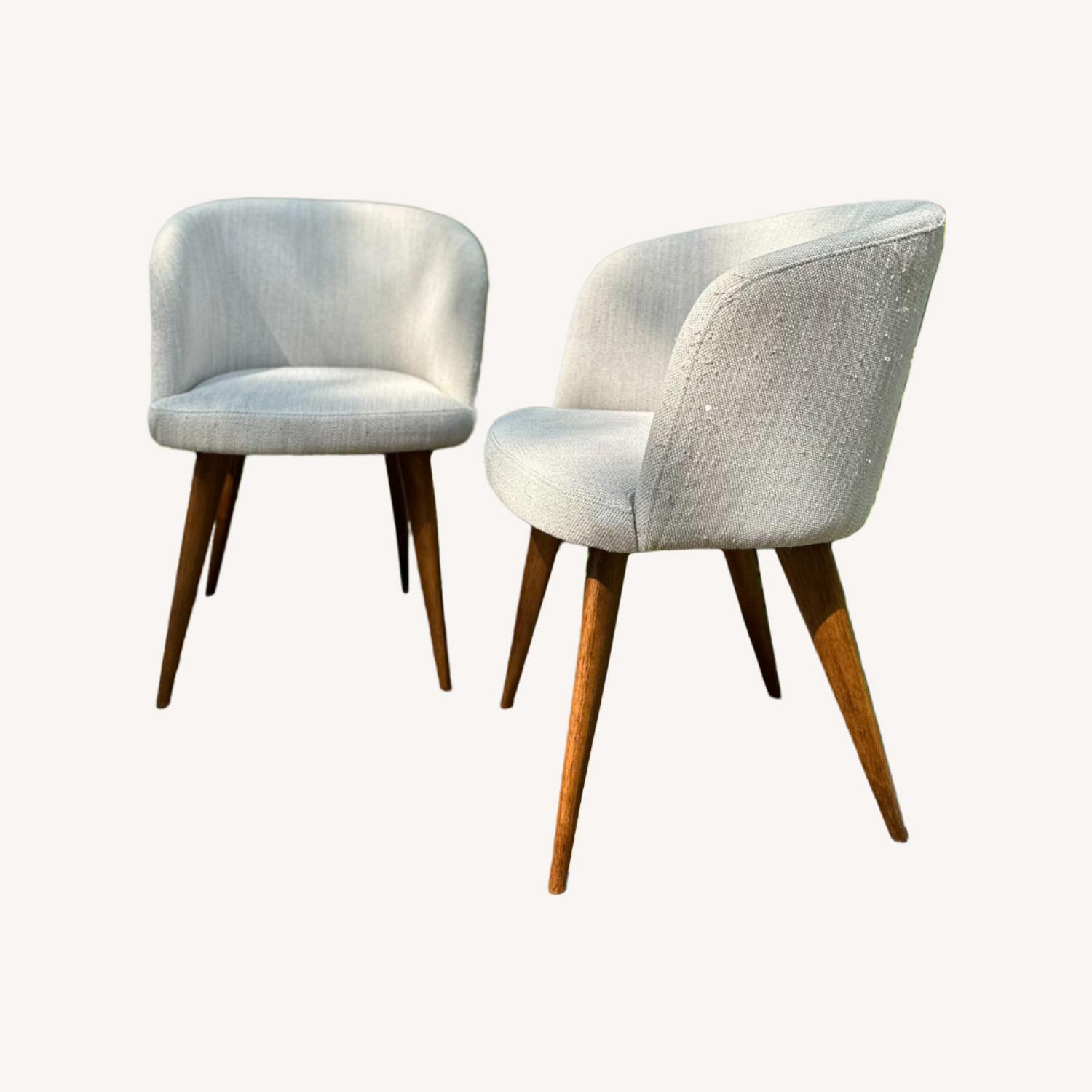 Seller's Notes:These Abrazo Dining Chairs have upholstered seats and backs and have been called the most comfortable seats in the house on more than one occasion. They have study and stylish wood legs with Gray Basketweave fabric. There are some pulls in the fabric (see photos) and I would like to pass them on while they are still in satisfactory condition. These chairs are the perfect candidates for reupholstering!