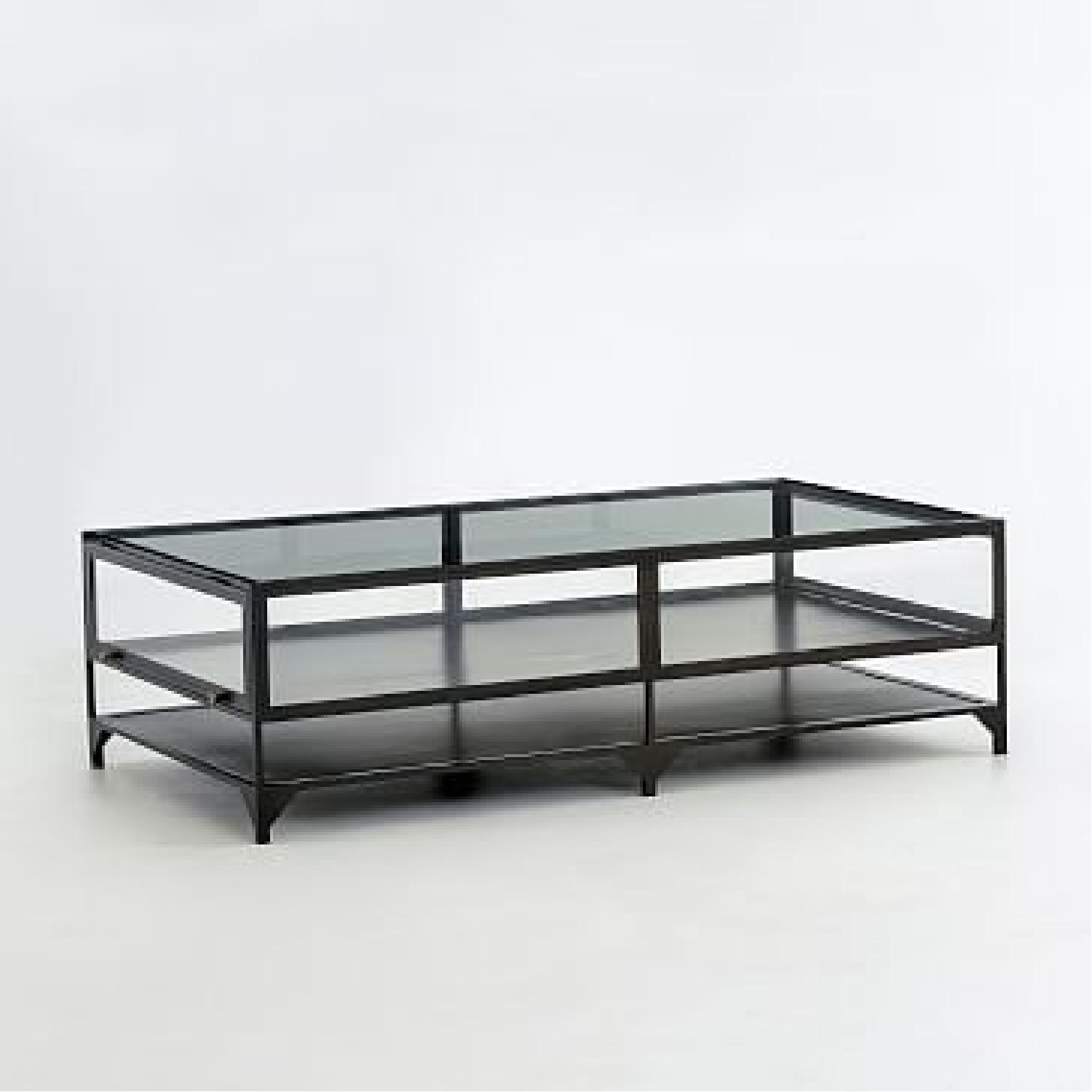 Seller's Notes:This Shadow Box Coffee Table from West Elm combines glass with a sturdy iron base in a dark metal finish. It provides ample storage both within the glass case and on a shelf underneath the table. Overall, it is in very good condition, with 2 minor scratches and a very small dent (all shown in images of table). We are moving and it will not fit in our new apartment.