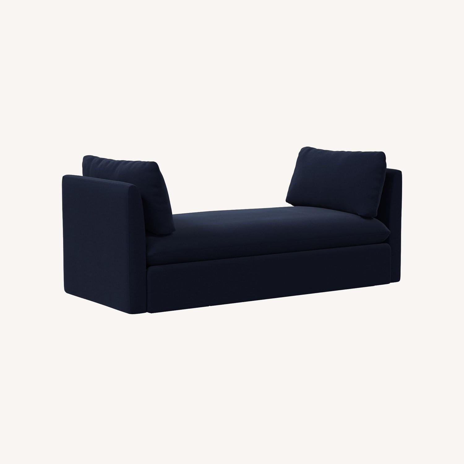 Seller's Notes:Hand-built frames with hand-finished upholstery. Solid oak and engineered hardwood frame with reinforced joinery. All wood is kiln dried for added durability. High-gauge sinuous springs provide cushion support. Seat cushion has fiber-wrapped, high-resiliency polyurethane foam cores. Seat firmness: Soft. On a scale from 1 to 5 (5 being firmest), we rate it a 2. Side cushions are poly fiber-filled. Reversible cushions (Astor Velvet excluded) with zip-off covers. Concealed support legs for a streamlined profile. Petite daybed fits at the end of a king-sized bed. Assembled in the USA.