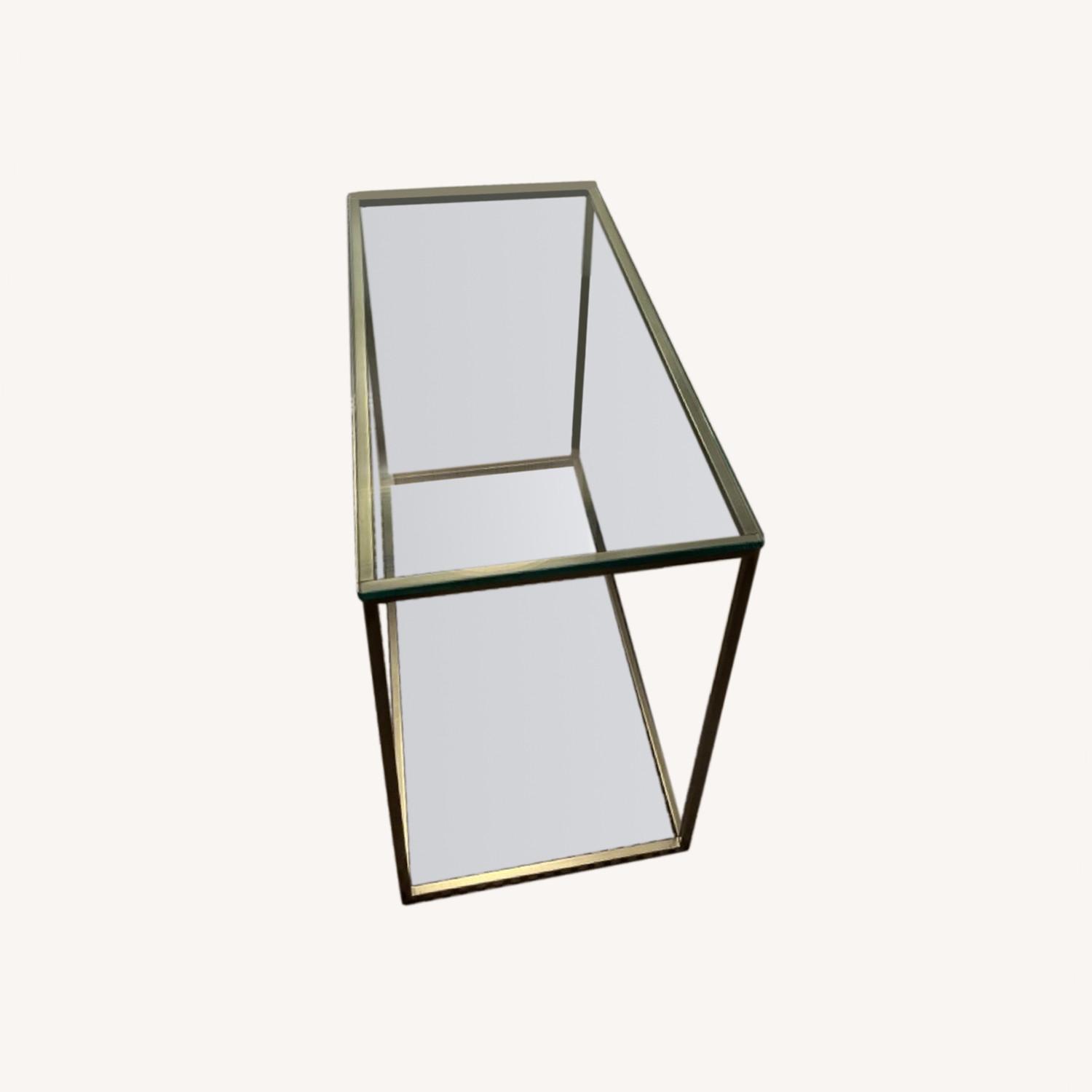 Seller's Notes:West Elm Streamline side table in glass, light bronze. Contract-grade. The tempered glass top rests atop a light bronze metal base. Note that the top is not secured to the base. Very minor scratches as shown in photos. Minimalist side table that looks airy and weightless, great if you're avoiding added visual clutter.