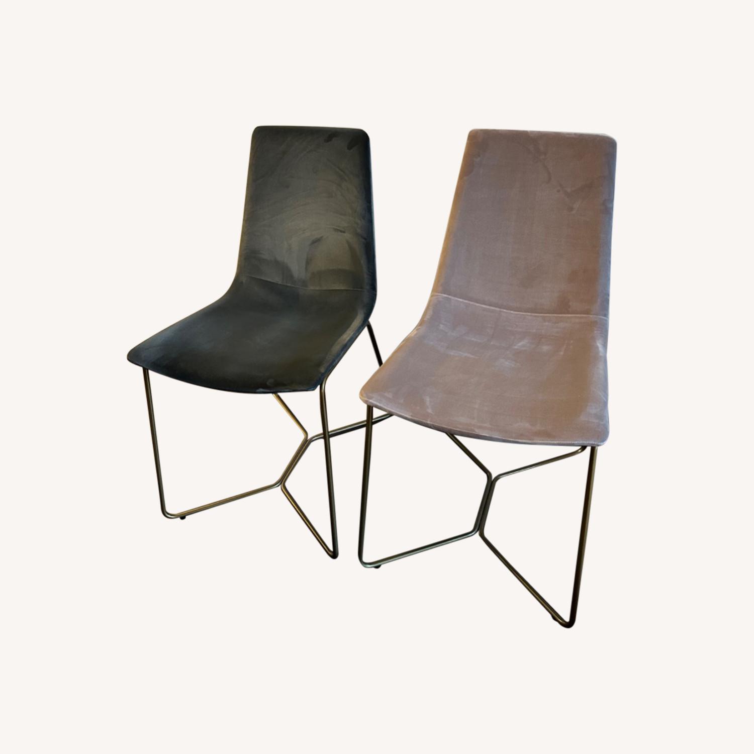 Seller's Notes:Gorgeous velvet slope dining chairs less than one year old. Elevates any dining room/kitchen. 2 gray and 2 mauve with brass hardware.