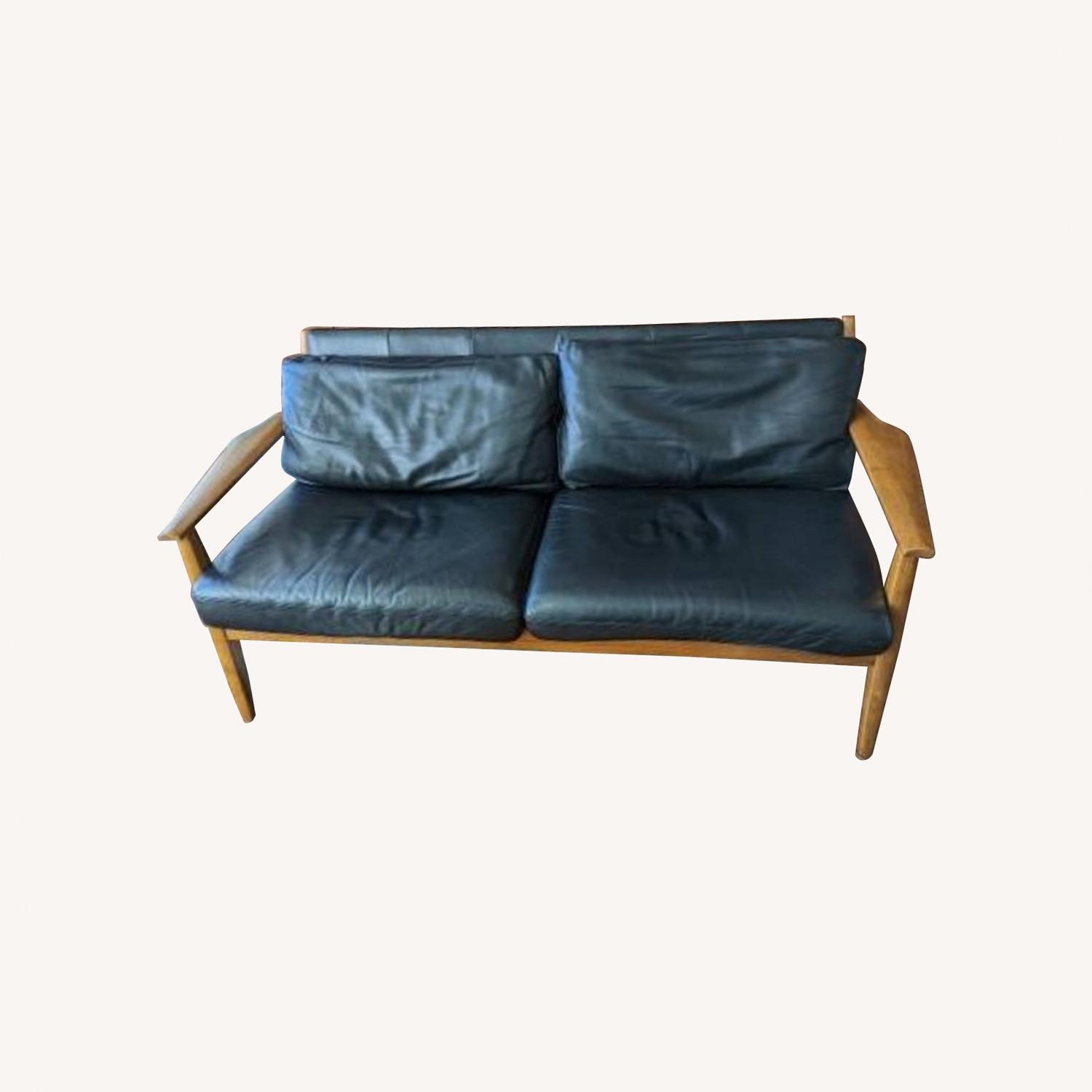 Seller's Notes:Mid-century-looking wood/leather sofa from West Elm. 5 years old. Quality wood frame with black leather cushions.