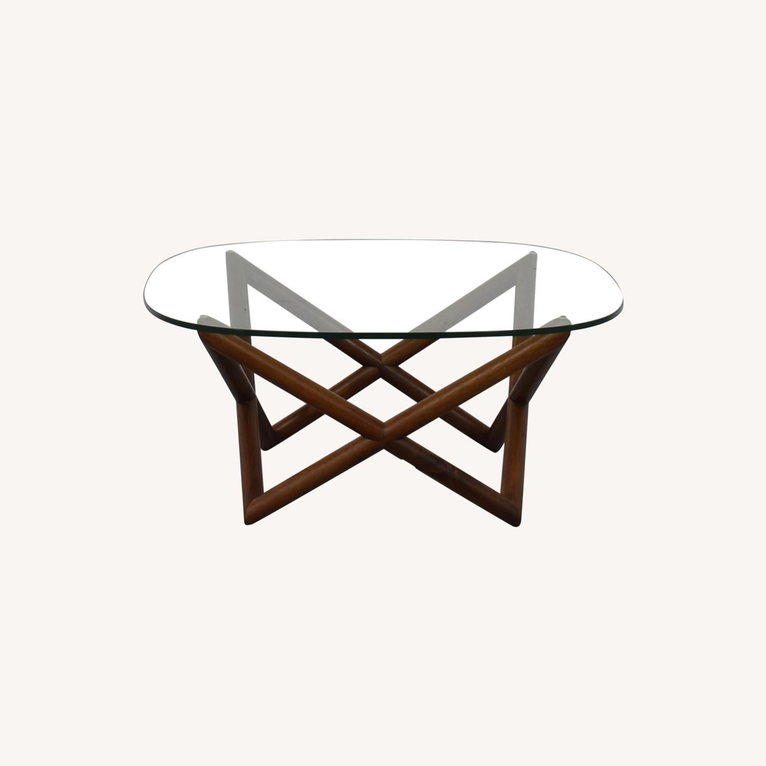 Seller's Notes:Coffee and Danish. Inspired by mid-century Danish design, this Spindle Coffee Table has an iconic geometric shape. The glass top and solid wood base combine for a retro, functional feel that appeals to many styles of eclectic décor. 36"w x 36"d x 16.25"h. Solid wood base in Honey finish. Tempered glass top.