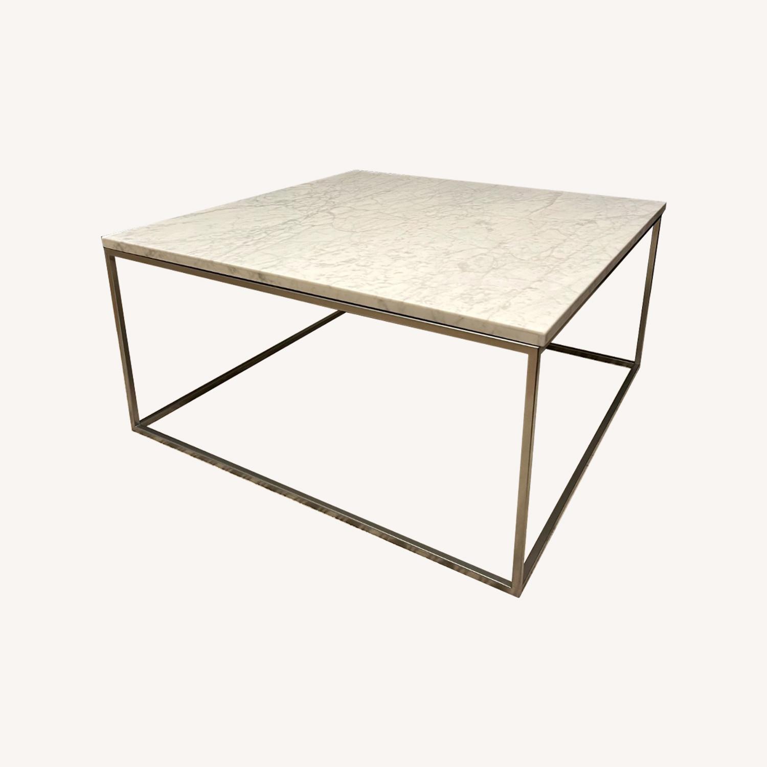 Seller's Notes:West Elm square coffee table in marble/chrome. Purchased in '20. Excellent condition. Dimensions: 32L x 32W x 16H