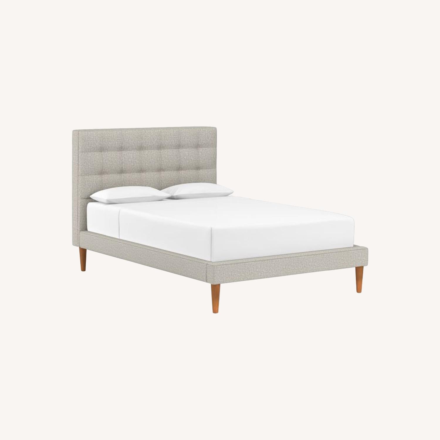 Seller's Notes:Very good condition King size upholstered bed in a stone twill fabric with tapered walnut finished legs.
