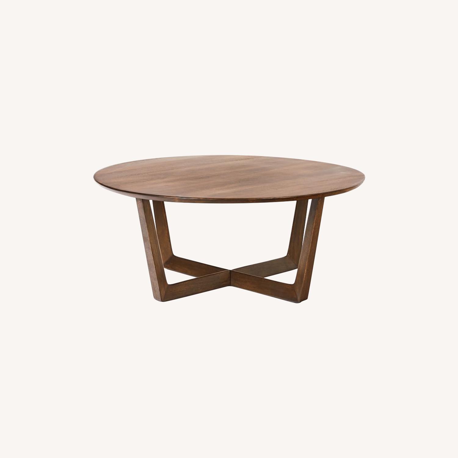 Seller's Notes:Inspired by the clean lines of Scandinavian design, our solid mango wood Stowe Coffee Table has a simple sculptural base for high style at a great price. 36"diam. x 15"h. Solid mango wood in a Dark Walnut finish.