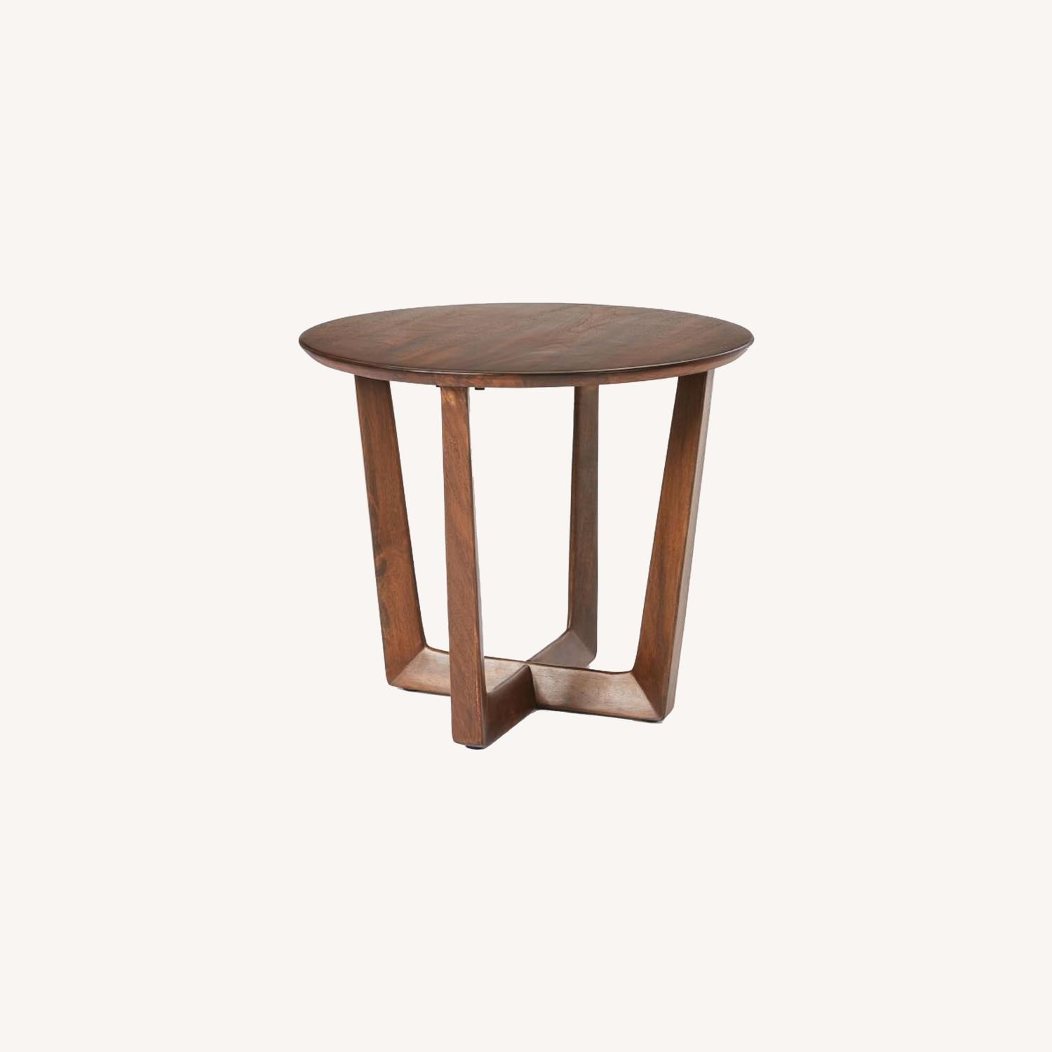 Seller's Notes:Inspired by the clean lines of Scandinavian design, our solid mango wood Stowe Side Table has a simple sculptural base for high style at a great price. 22"diam. x 18"h. Solid mango wood in a Dark Walnut finish.