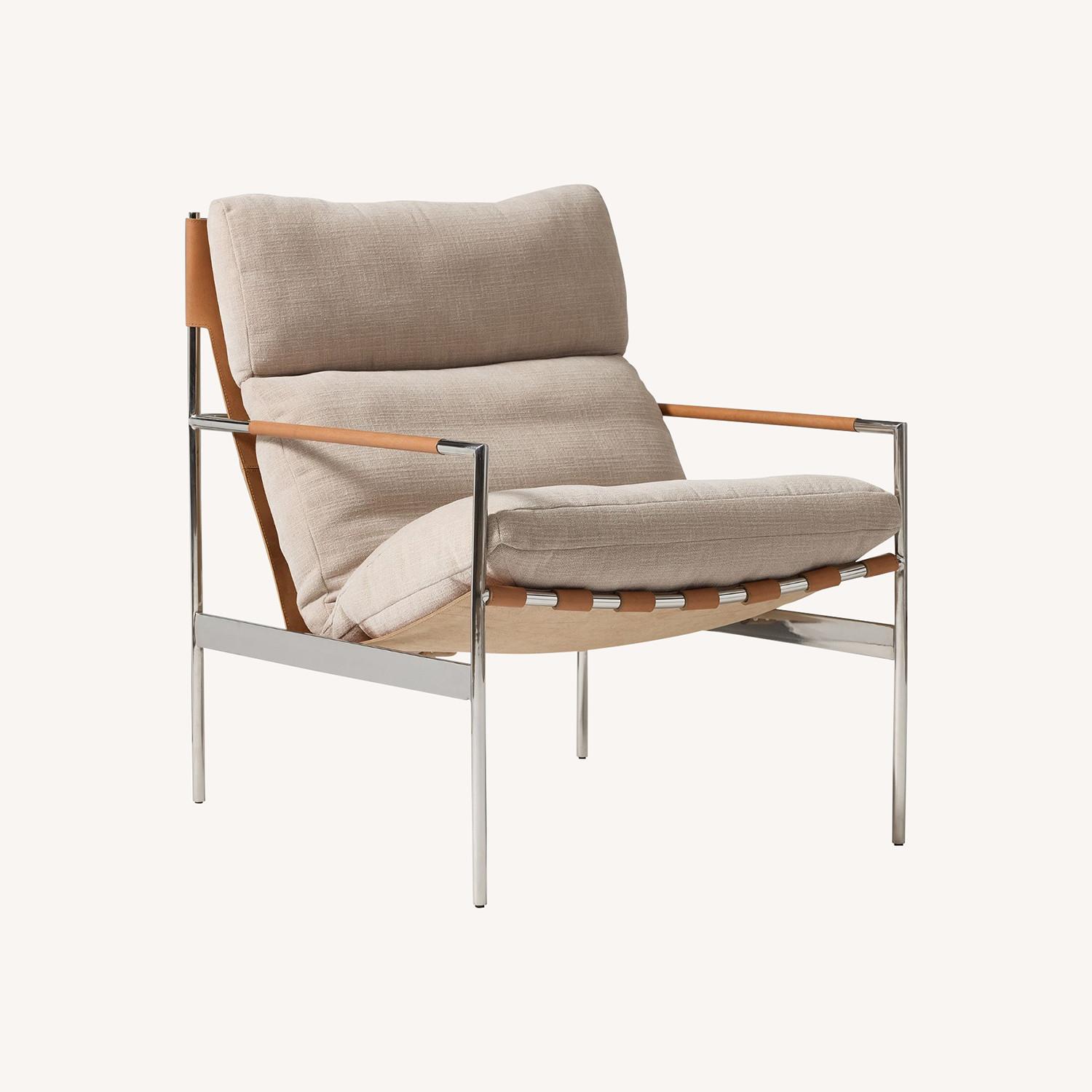 Seller's Notes:Chenille Crossweave (80% recycled polyester, 20% polyester) upholstery in Sand. Leather-wrapped metal frame and legs in a Polished Stainless Steel finish. Seat and back cushion are stitched together and filled with loose polyester fibers. Seat firmness: Soft. On a scale from 1 to 5 (5 being firmest), it's a 1. Semi-attached cushion. Made in India.