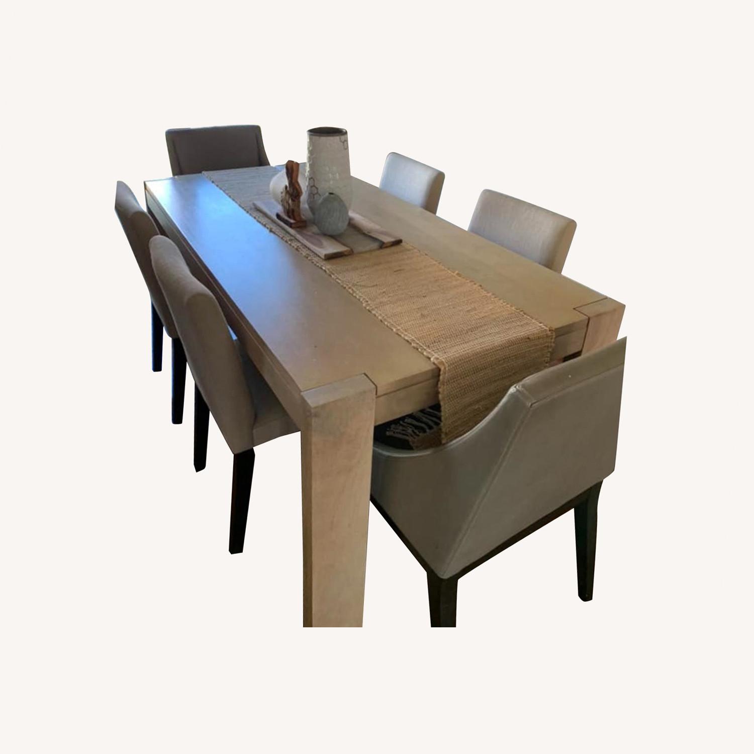 Seller's Notes:For sale. West Elm Dining Room Table and Six Chairs. Two Chairs are Leather and Four are Fabric.