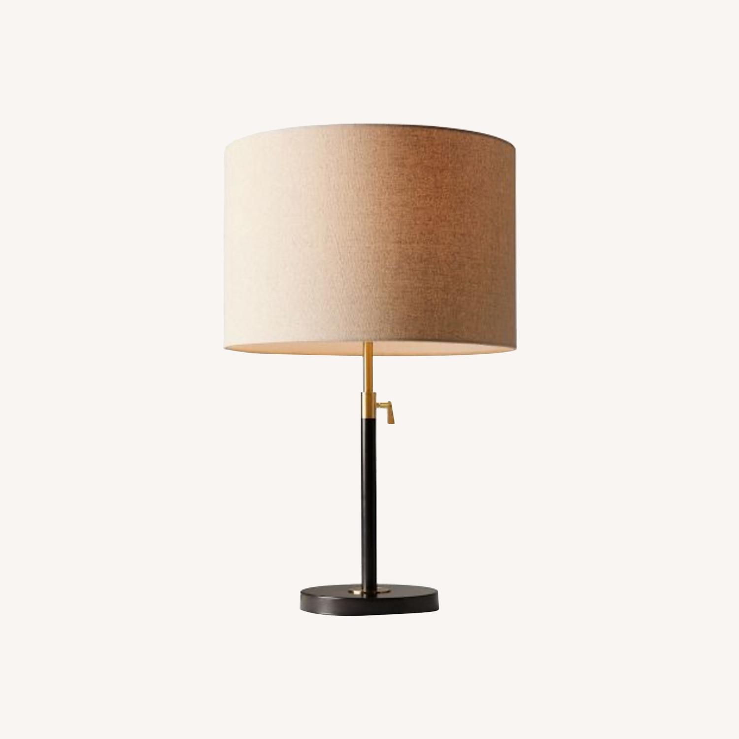 Seller's Notes:West Elm Contract Grade - Telescoping Adjustable Table Lamp (23") (PAIR) Hardly used in guest room now converted babies room. Metal frame with Satin Black finish. Antique Brass-finished metal detailing. Natural linen shade. Adjustable height. Plug in. Clear PVC cord with rotary On/Off switch. May be paired with dimmable smart bulbs