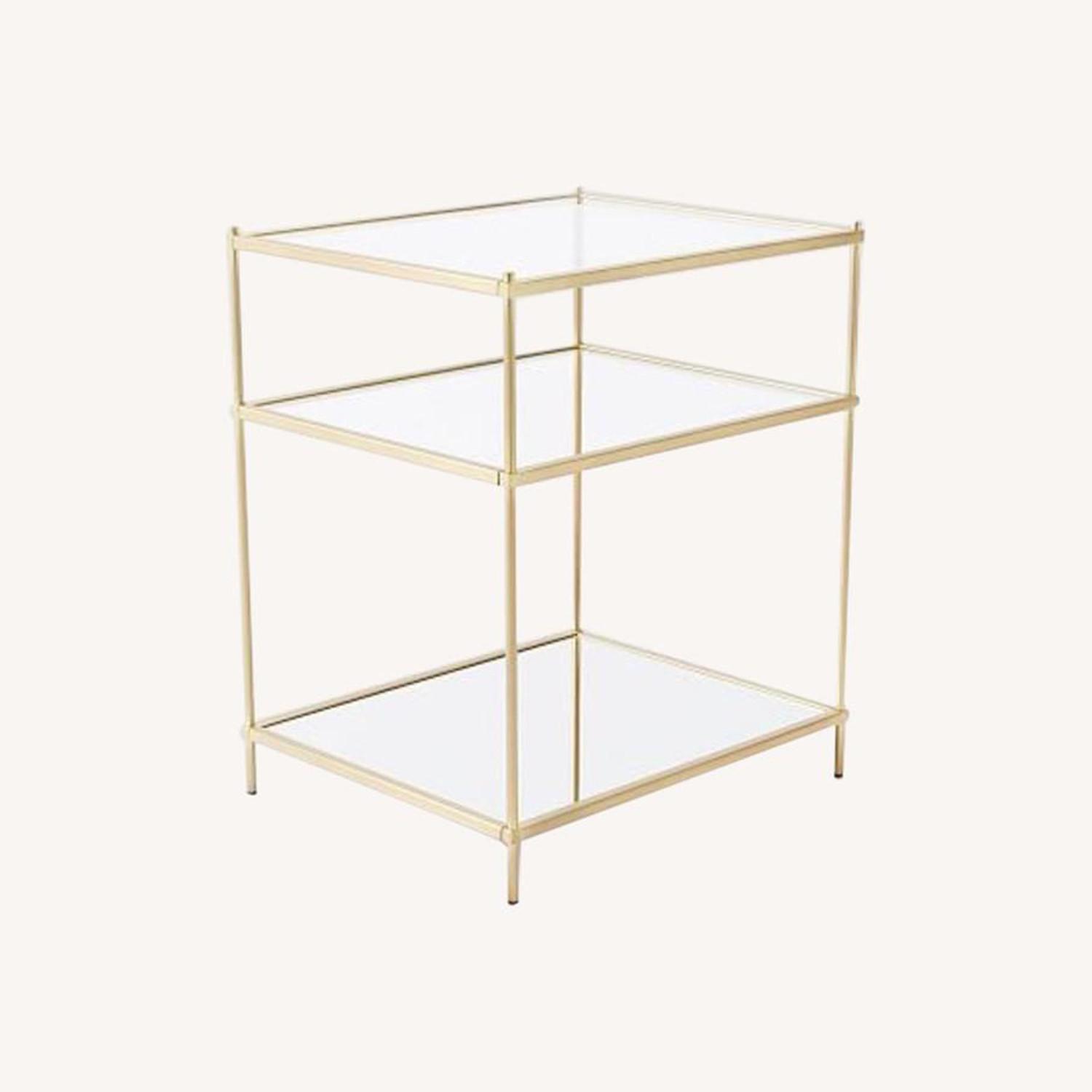 Seller's Notes:Antique Brass-finished metal frame. Clear, tempered glass top shelves. Mirrored bottom shelf.