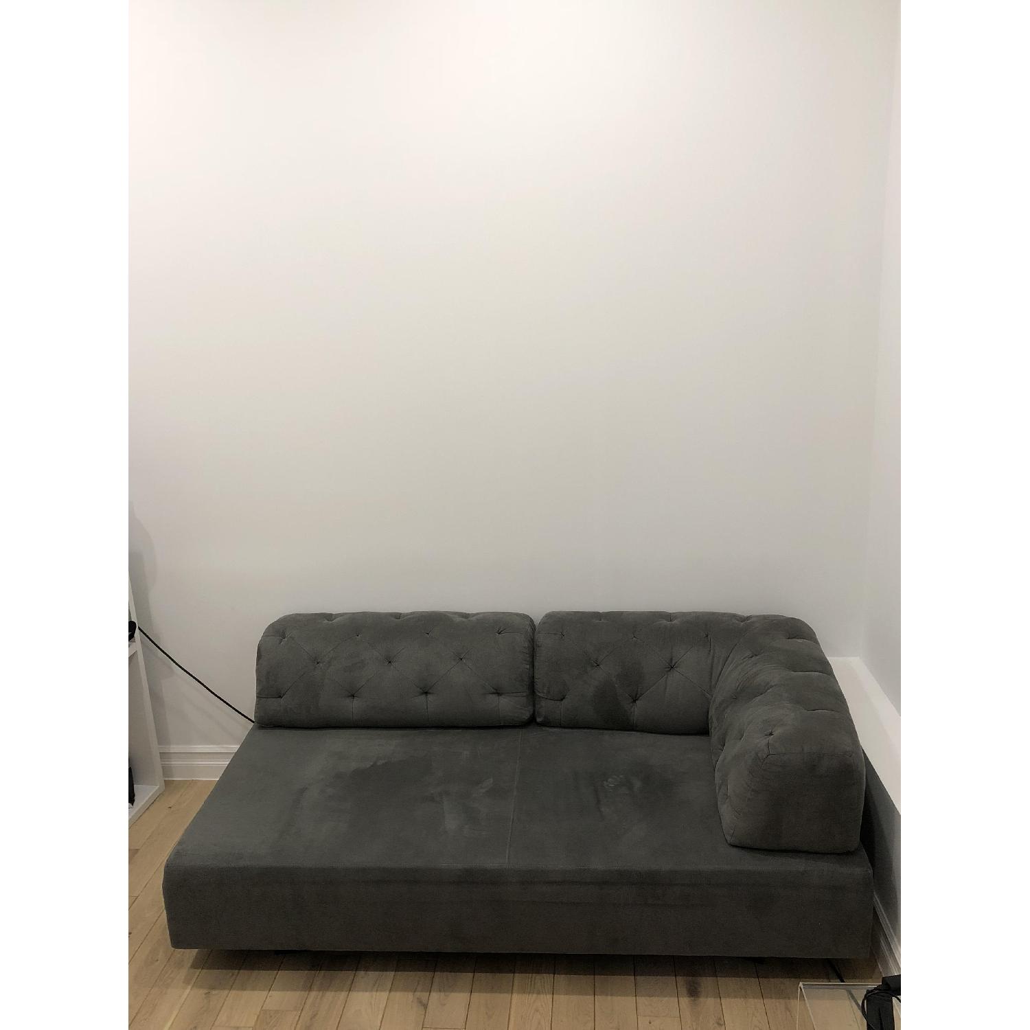 Seller's Notes:West Elm Tufted Tillary Sofa -Dove grey, soft and stain resistant micro suede -Moveable side arm and weighted back cushion can be configured to suit many different angles and spatial needs -Works perfectly as twin sized sleeper -Beautiful in studio living room, playroom or office