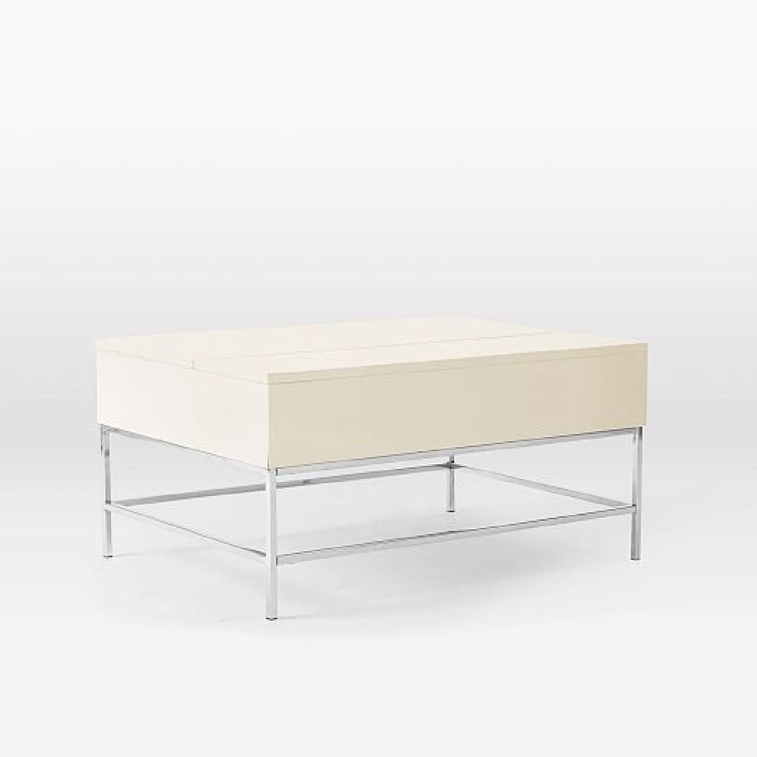 Seller's Notes:West Elm white lacquer coffee table Storage space inside Beautiful design Very modern look Environment: no pets, no smoking, no kids
