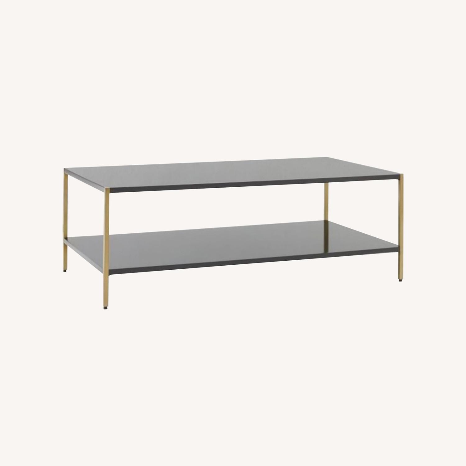 Seller's Notes:West Elm Zane Coffee Table in dark charcoal Grey. It is a bi-level coffee table so super functional for both display and storage. Hardware on corners is brass with minor tarnishing. Scratch on one side of table but hardly noticeable.