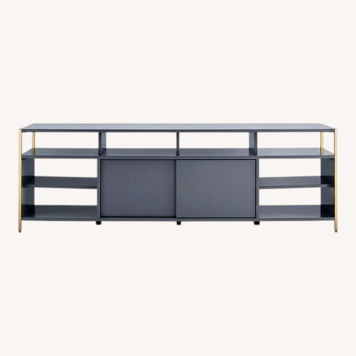 Seller's Notes:Engineered wood case. Stainless steel frame and details in an Antique Brass finish. Covered in a lacquer finish. Accommodates a flat screen TV up to 65"w. Each compartment features an adjustable shelf. Eight cutout openings at back for cord management. Two doors slide open to reveal an interior compartment with adjustable shelves. Open compartments.