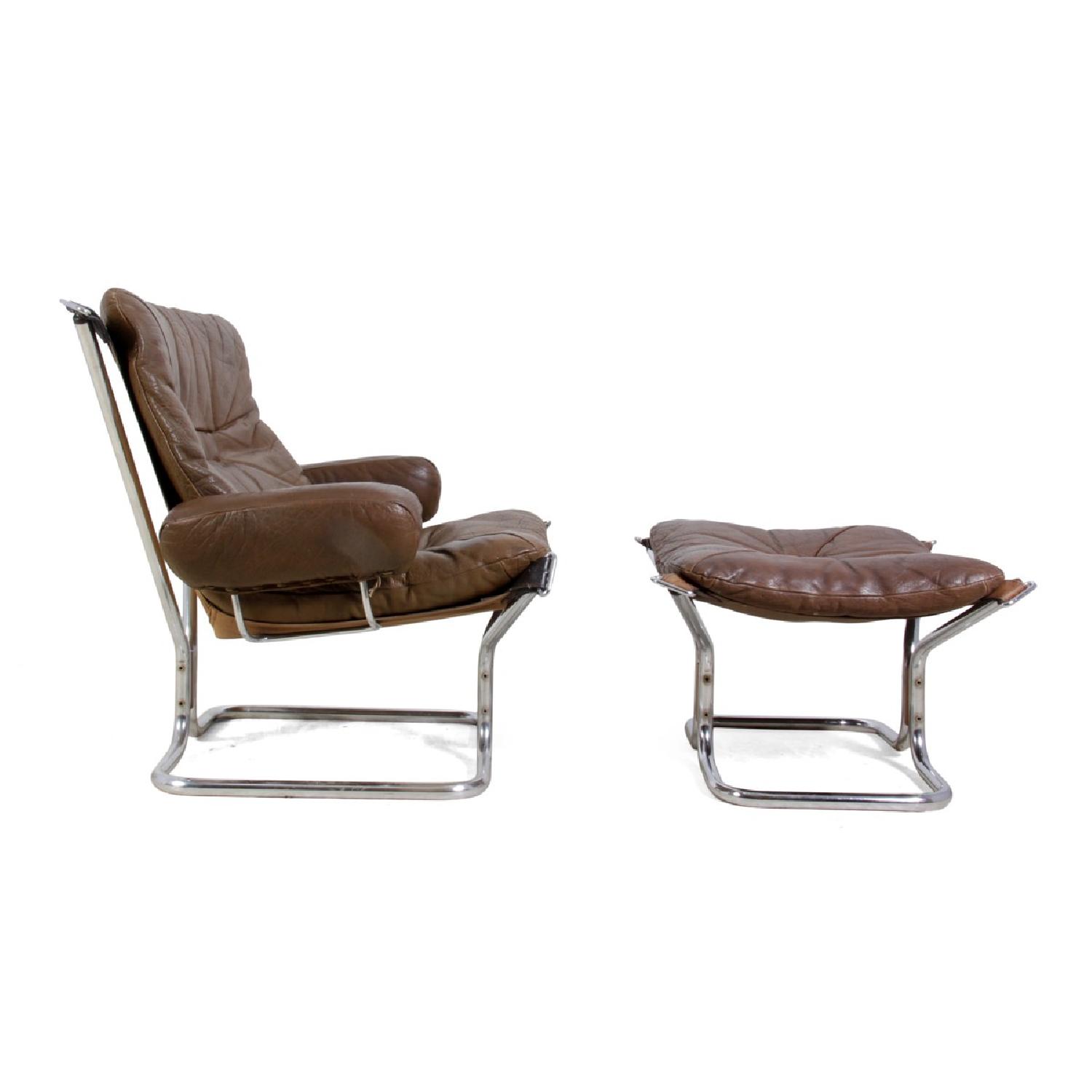Seller's Notes:Offering a leather chair by Ingmar Relling for Westnofa, circa 1970. It is an icon of mid-century danish design. This one is in very good, original condition. The chair has chromed supports, solid rosewood spacers with a good thick leather patinated upholstery. This iconic Relling design sells for upwards of $4,000 in this condition. Comes with Ottoman.