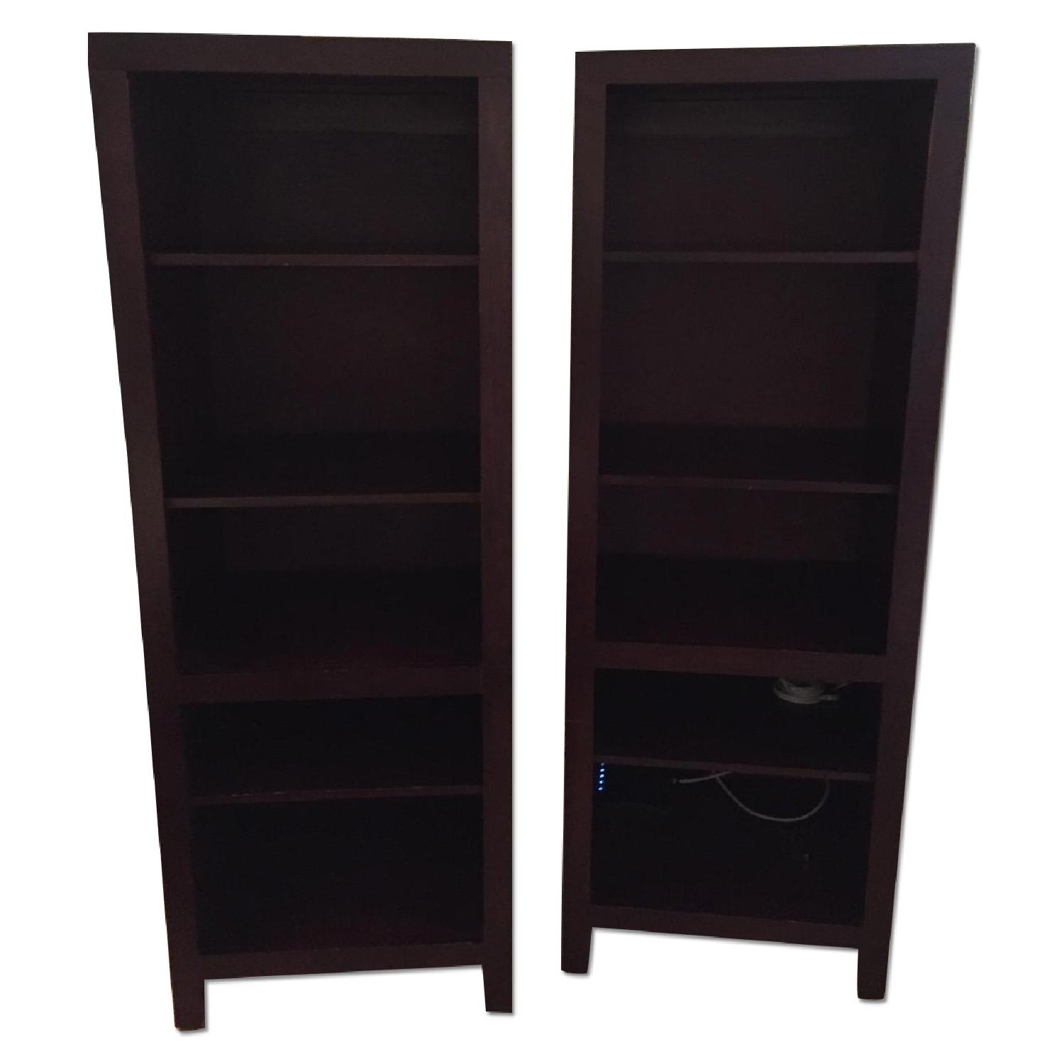Seller's Notes:Two wooden bookcases. 5 shelves. Bottom shelf on each bookcase has an opening for wires. Smoke/pet free home. Minor scratches on wood.